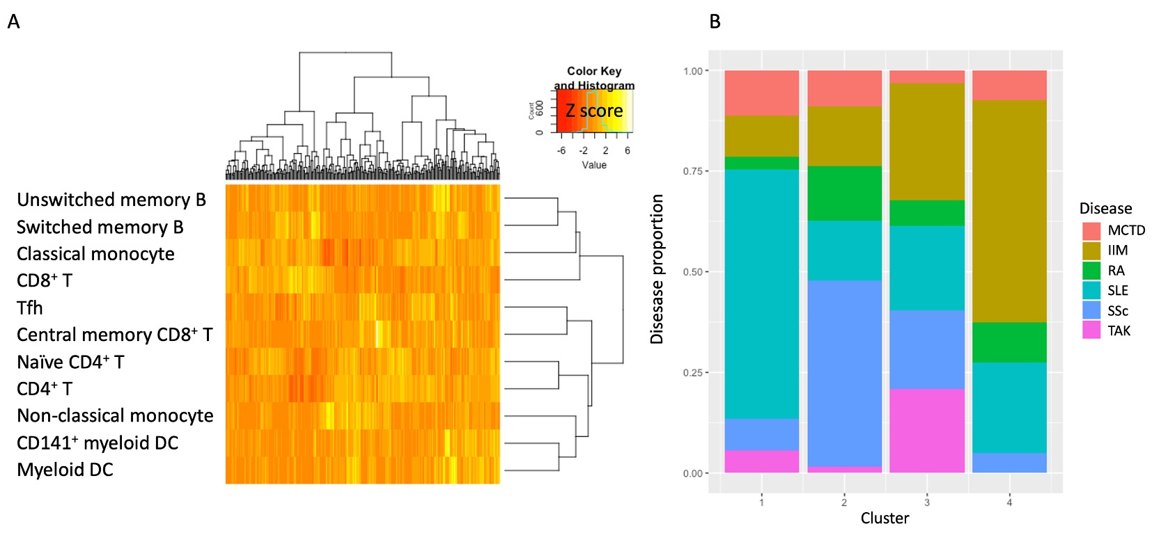 Figure 1. Heatmap of hierarchical clustering of 11 types of immune cells (A) and Proportion of disease in four clusters (B).