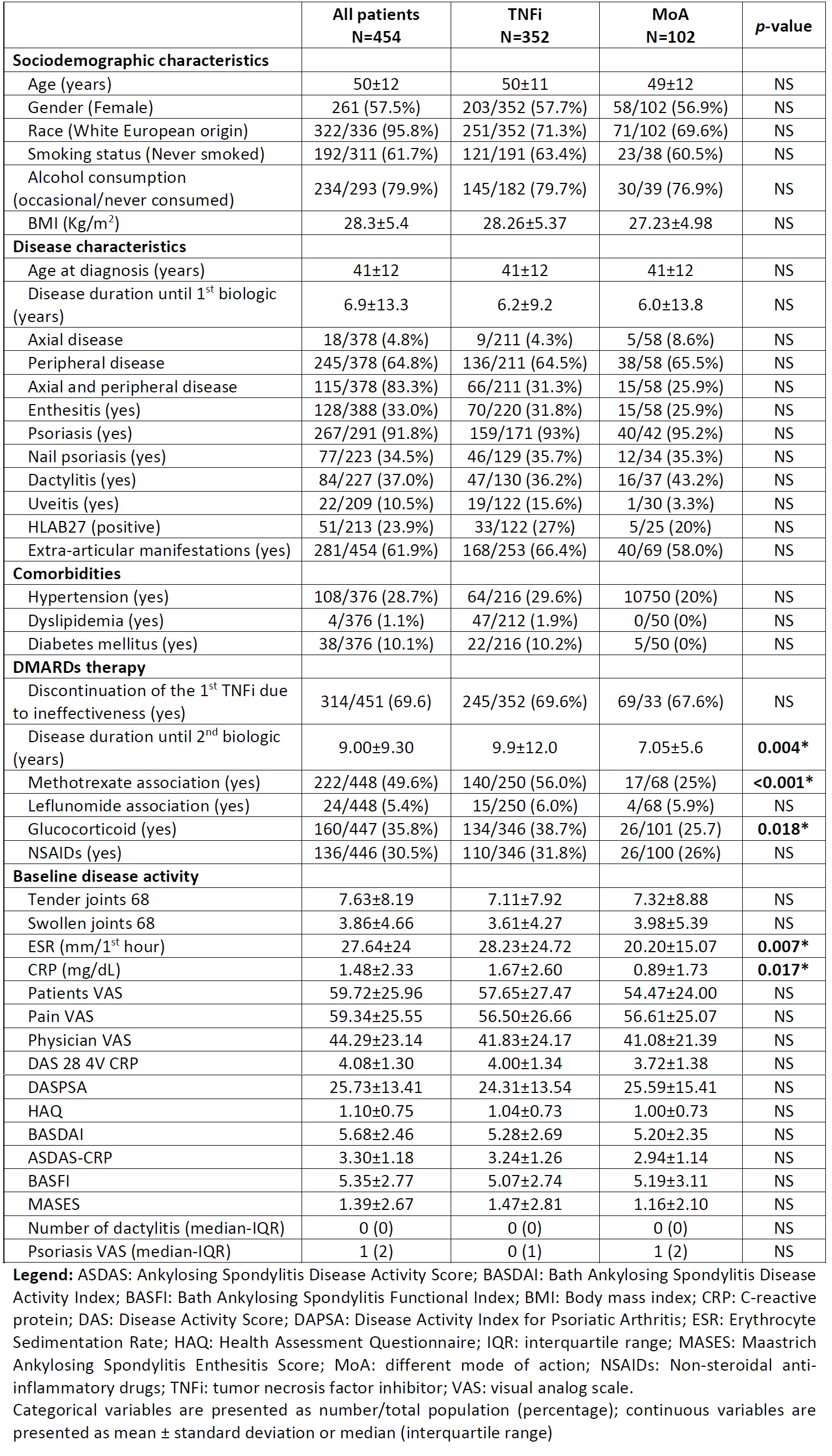 Results: In total, 454 patients were included, 57.5% were female, with a mean age of 50±12 years old. Baseline characteristics are described in Table 1. Of those, 77.5% initiated a 2nd TNFi and 22.5% a drug with a different mode of action (64 SEK and 36 UST). Most patients discontinued the 1st TNFi due to inefficacy (69.2%), mainly secondary (56.6%).