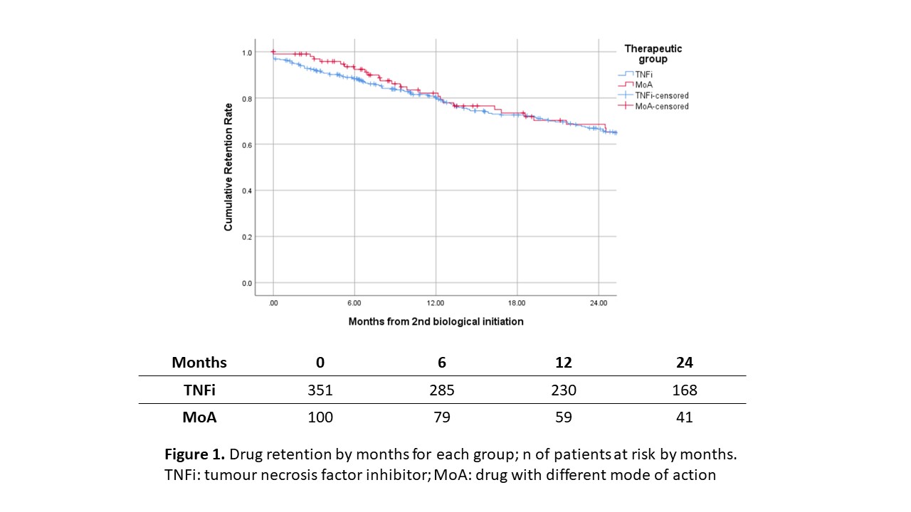 Methods: Retrospective longitudinal cohort study with a 2-year period of follow-up using real-world anonymous patient-level data from the Nationwide Portuguese Reuma.pt database. Patients with a diagnosis of PsA, (fulfilling CASPAR classification criteria) with previous treatment failure to a first-line TNFi that started a second biotechnological drug (TNFi, SEK, UST) were included. Sociodemographic data, disease characteristics, disease activity scores and physical function at baseline and after 6,12 and 24 months were recorded. Drug retention was estimated using Kaplan-Meier and Cox models. Crude and LUNDEX adjusted response rates were evaluated at 6, 12 and 24 months. SPSS v25 was used for statistical analysis and significance level was defined as 2-sided p< 0.05.