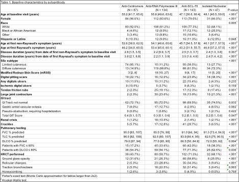 Background/Purpose: We sought to describe the autoantibody profile of SSc patients with early disease and examine the clinical, laboratory and prognostic features associated with these antibody subsets.