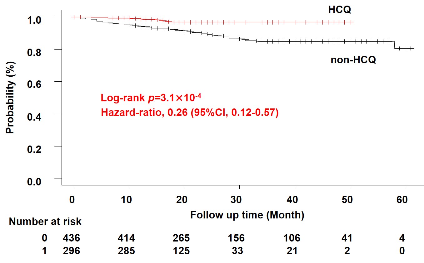 Figure Probability of first severe infection during follow up period. The patients were divided into two groups, HCQ and non-HCQ group. We conducted a survival time analysis of first severe infection during follow up period. The results showed that the HCQ group had a significantly lower incidence of infection.