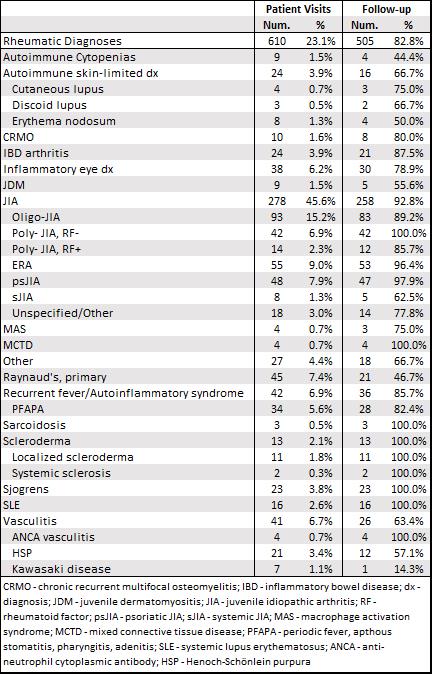 Table 3. Non-Rheumatic Diagnoses Disclosures: D. Reiff, Pfizer; M. Mannion, None; E. Smitherman, None; M. Stoll, Novartis; P. Weiser, None; R. Cron, SOBI, Sironax, Lilly.