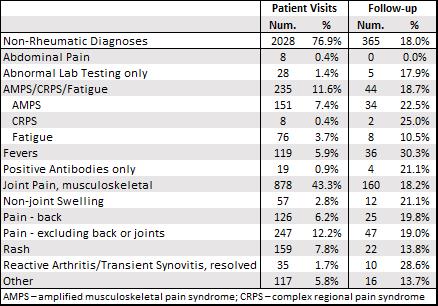 Results: During the study period, 2638 new patients were referred to the University of Alabama at Birmingham Pediatric Rheumatology clinic. On average, 73 new patients were referred per month, with monthly referrals peaking at 137 visits in March 2021 and reaching their nadir - 30 and 31 referrals in March and April 2020, respectively - due to restricted in-person visits at the onset of COVID-19 protocols. Of the total referred patients, 610 (23.1%) were diagnosed with a rheumatic condition during their initial or follow-up appointments. Juvenile idiopathic arthritis (JIA) was the most frequent diagnosis at 45.6% of patients, including oligoarticular JIA and enthesitis-related JIA at 15.2% and 9.0% of patients respectively. The next most common diagnoses were primary Raynaud's phenomenon at 7.4%, recurrent fever or autoinflammatory syndromes at 6.9%, vasculitides at 6.7%, and inflammatory eye conditions at 6.2%. Inflammatory bowel disease arthropathy, Sjogren's syndrome, systemic lupus erythematosus, and juvenile dermatomyositis each made up less than 5% of total diagnoses. Non-rheumatic diagnoses totaled 76.9% (2028 pts) of referrals. Pain was the most common non-rheumatic diagnosis, with musculoskeletal joint pain (878 patients, 43.3%), back pain (126, 6.2%), and extremity/muscle pain (247, 12.2%) together representing over half of all referred patients. Amplified musculoskeletal pain syndrome, complex regional pain syndrome, and chronic fatigue collectively made up 11.6% of non-rheumatic diagnoses, with rash and fevers following at 7.8% and 5.9% respectively. Only 33% of all referred patients were ever seen for a follow-up visit, including 82.8% of rheumatic diagnoses and 18% of non- rheumatic diagnoses.
