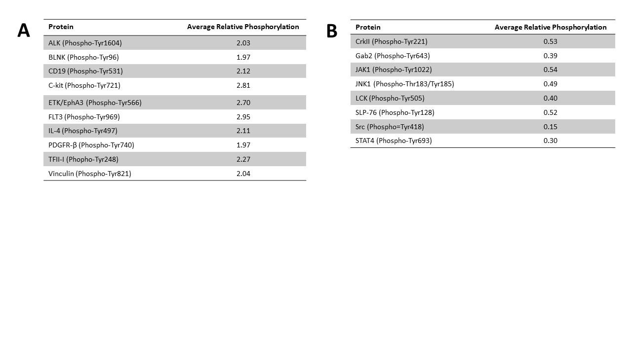 Figure 2. A. Abridged list of 10 (out of 228) proteins with increased phosphorylation in SSc vs. HC skin. *Relative phosphorylation level (SSc/HC) > 2. B. Abridged list of 8 proteins with decreased phosphorylation in SSc vs. HC skin. *Relative phosphorylation level (SSc/HC) < 0.5.