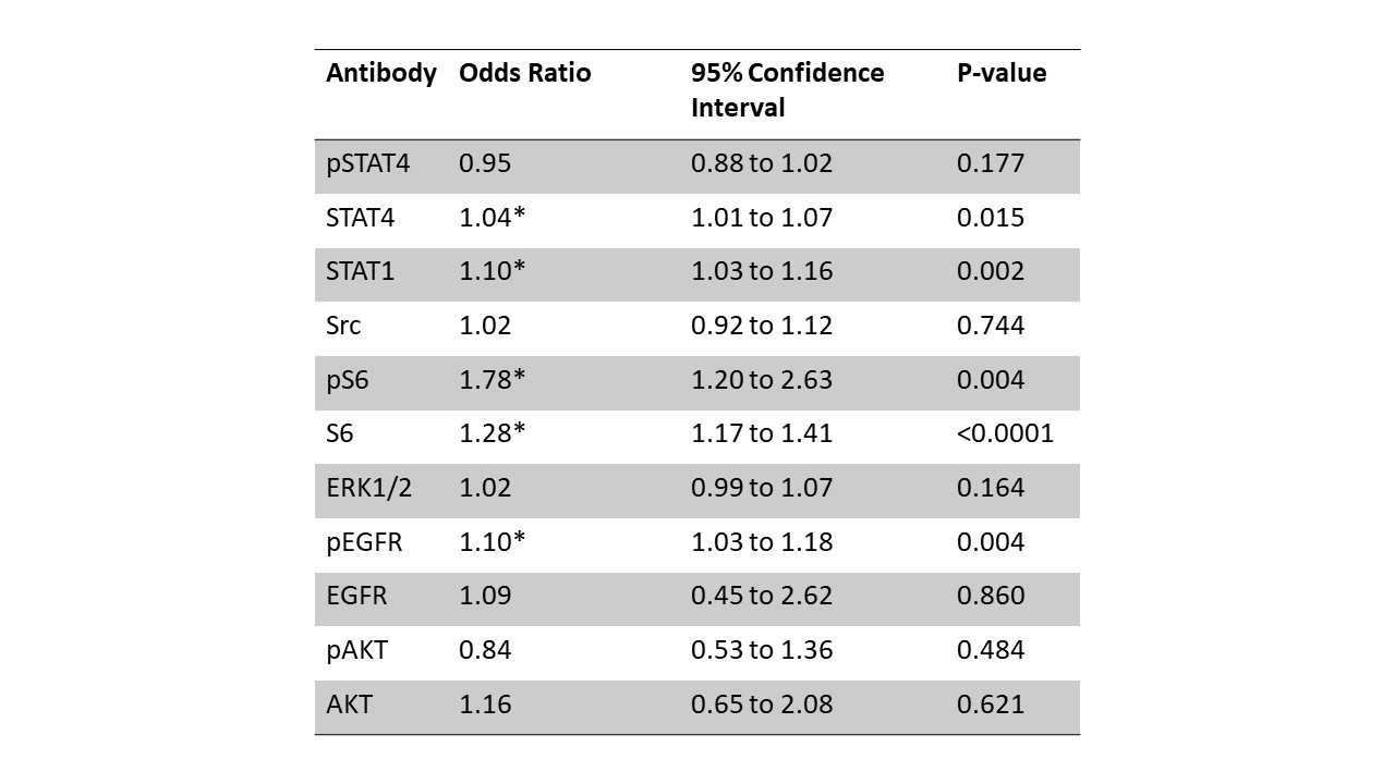 Figure 3. A. Odds ratio and 95% confidence interval for IHC proteins. *p < 0.05, CI > 1.0.