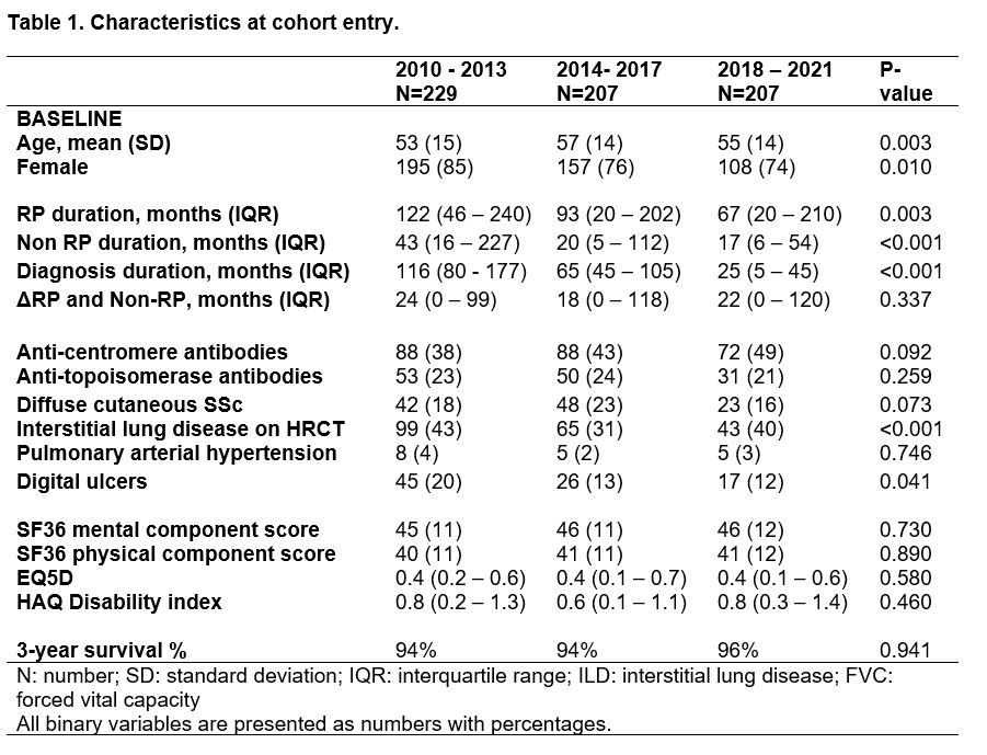Methods: 643 SSc-patients fulfilling ACR/EULAR 2013 SSc criteria, were included, and categorized into three groups based on cohort entry year: 1) 2010–2013 (n=229,36%), 2) 2014–2017 (n=207,32%), and 3) 2018–2021 (n=207,32%). Characteristics included disease duration (=months since RP, first non-RP symptom and first date of diagnosis by a physician), interstitial lung disease (ILD; =presence of ILD on HRCT and FVC< 80%), pulmonary arterial hypertension, digital ulcers (DU), diffuse cutaneous SSc (dcSSc), ATA and ACA. Characteristics were compared between cohort entry groups, using appropriate tests. Survival for a 3-year follow-up period was evaluated and compared between the groups.