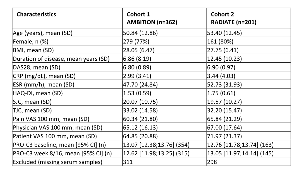 Table 1: Patient demographics and baseline characteristics of the AMBITION (early-stage RA) and RADIATE (late-stage RA) cohorts.