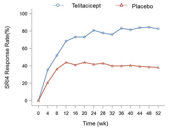 Results: A total of 335 patients were randomized to receive Telitacicept 160 mg (n=167) or placebo (n=168). Baseline demographics and disease characteristics were similar between treatment groups. Of randomized patients, 236 (70.4%) completed 52 weeks of treatment. The primary endpoint at week 52 was met, with significantly greater proportion of patients in Telitacicept 160 mg group achieving SRI4 response as compared with the placebo group (82.6% vs. 38.1%, p< 0.001). The SRI4 response was significantly greater in the Telitacicept group as compared with the placebo group as early as Week 4, and the significant difference was sustained up to week 52 (p < 0.01 for all time points) (Figure 1).