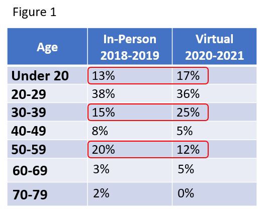 Results: In 2020-2021 there were 203 surveys (54%) submitted vs. 159 (90%) surveys in 2018-2019. Most (79%) respondents identified as female, 20% male, 53% Hispanic, 49% African American, 19% White, 7% Asian & 25% other race. Similar demographics were noted when comparing participants for 2018-2019. There was an decrease in Hispanic participants by 11% & an increase in African American participants from 37% to 49% in 2020-2021. Regarding age distribution of respondents for 2020-2021, there were increases in reaching our target population (see figure 1).