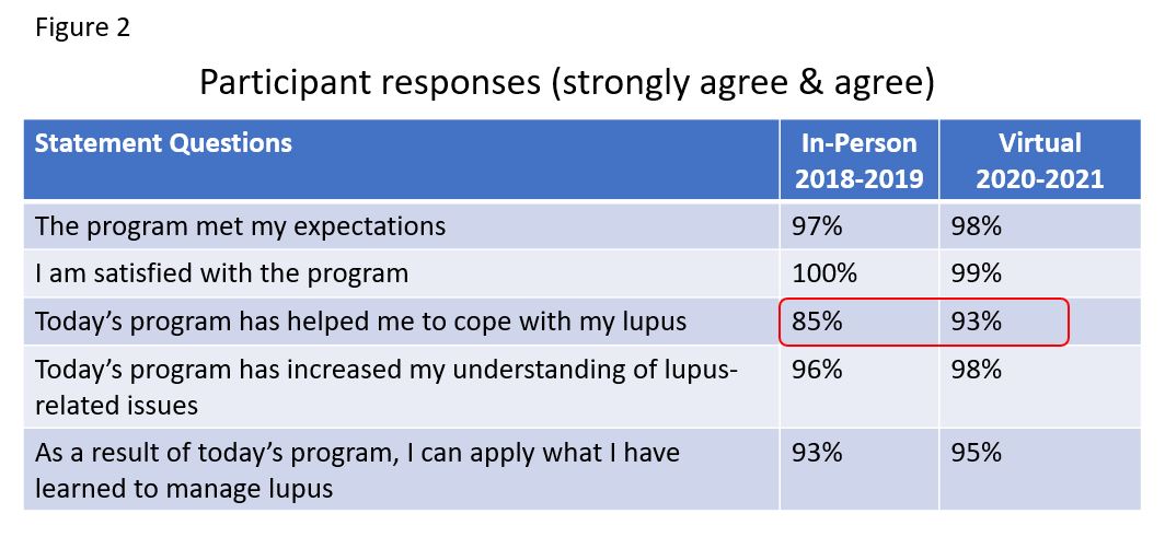Almost all (99%) respondents reported satisfaction with the virtual groups; 98% agreed that the groups increased their understanding of SLE-related issues; 93% agreed the groups helped them cope with SLE; 95% agreed they could apply what they learned to manage SLE; 98% agreed the program met their expectations & 97% agreed that they would recommend this group. No significant differences were noticed in the areas above when comparing in-person groups conducted in 2018-2019. There was an 8% increase when respondents were asked about the group's ability to help them cope with SLE in the virtual group (see figure 2).