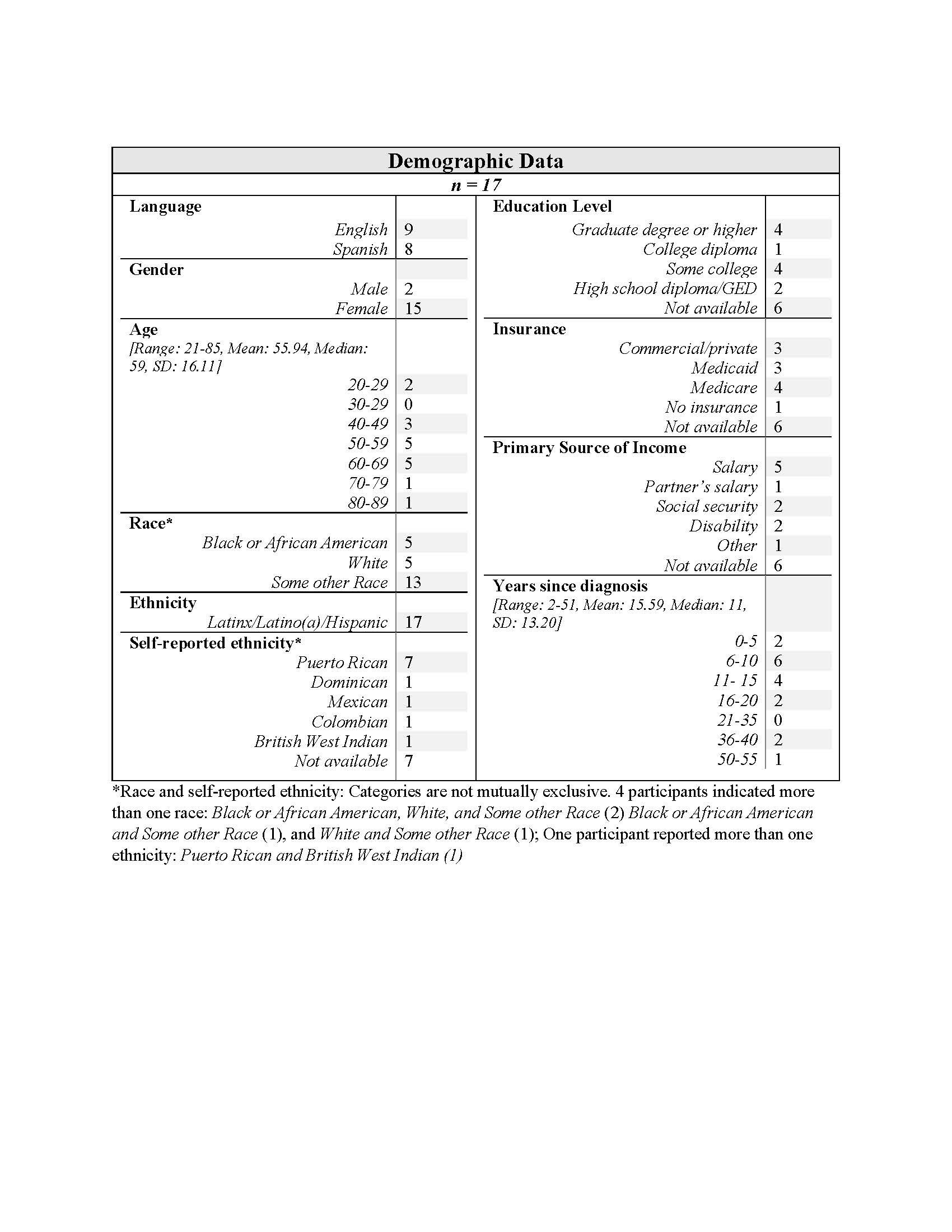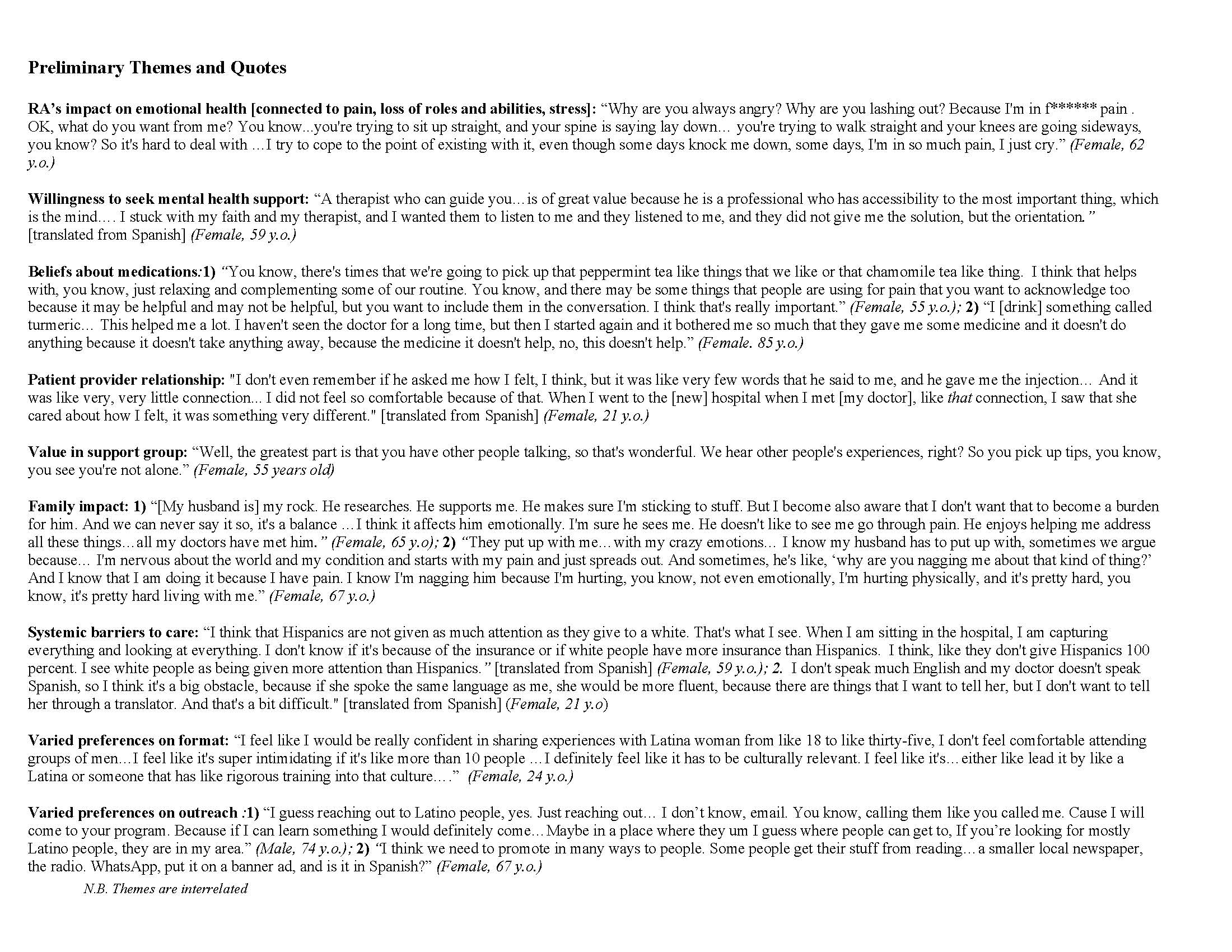 Results: To date, 17 Latinx RA patients (8 Spanish-speaking, 9 English-speaking) have participated. (Table 1: Demographics). Recruitment is ongoing. Preliminary results have revealed 9 emerging themes. These themes are interrelated, and include: RA's impact on emotional health (connected to pain, feelings of loss about roles and abilities, and stress); willingness to seek mental health care; medication and illness beliefs affecting patients' approach to RA management; essential features of a good patient-provider relationship (trust, feeling cared for and heard, kindness, and consistency); value of participating in a support group (sharing, connection, and feeling less alone); impact on family (relationship dynamics, presence/absence of support); patient experience of systemic barriers to care; varied preferences on structure and format (group size, facilitator attributes, in-person or virtual), and varied preferences on outreach strategies (postal mail, referral source, phone calls, emails, and social media). (Table 2: Preliminary Themes and Quotes).
