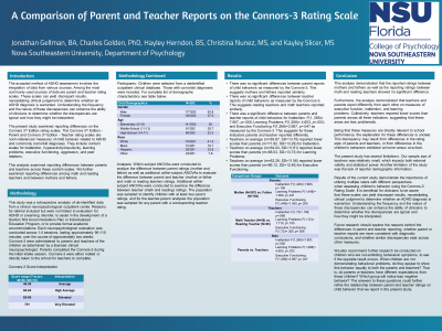 Methods: Children (N=194, Mage=10.75, Medu=4.87, 41.3% white, and 62.8% male) with corresponding parents and teachers were selected from a deidentified clinical outpatient database. Respondents included mothers (n=287), fathers (n=194), math teachers (n=58), and reading teachers (n=26). Within subjects ANOVAs were used to compare mother and father ratings, math teacher and reading teacher ratings, and parents and teacher ratings on the Conners 3 Rating Scale.