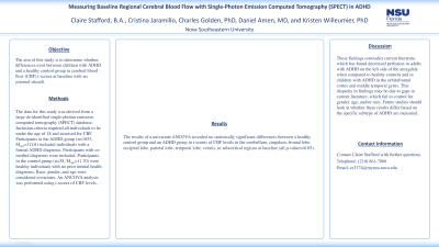 Methods: The data for this study was derived from a large de-identified single-photon emission computed tomography (SPECT) database. Inclusion criteria required all individuals to be under the age of 18 and assessed for CBF. Participants in the ADHD group (n=1853, Mage=12.01) included individuals with a formal ADHD diagnosis. Participants with co-morbid diagnoses were included. Participants in the control group (n=38, Mage=11.70) were healthy individuals with no prior mental health diagnoses. Race, gender, and age were considered covariates. An ANCOVA analysis was performed using t-scores of CBF levels.