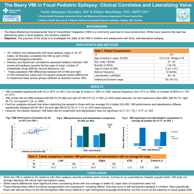 Conclusion. While the VMI is related to IQ, relations with other epilepsy variables were minimal and despite popular belief, VMI does not strongly lateralize left and right hemisphere cases likely due to functional reorganization/crowding effects that may occur in left hemisphere epilepsy.
