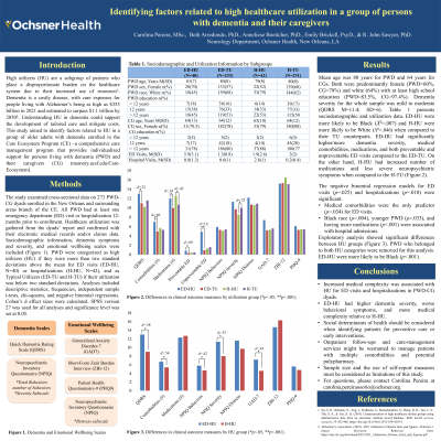 Methods: Cross-sectional data on persons with dementia (PWD) and caregivers (CG) enrolled in a branch of the Care Ecosystem Program (memory.ucsf.edu/Care-Ecosystem) were used. PWD had one emergency department (ED) visit or hospitalization prior 12-months. Data for 273 dyads included sociodemographics, healthcare utilization, dementia severity (Quick Dementia Rating Scale), and emotional wellbeing (i.e., Short-Form Zarit Burden Interview, Patient Health Questionnaire-9, Generalized Anxiety Disorder-7). High utilizers (HU) were more than two standard deviations above the mean for ED visits (N=40) or hospitalizations (N=42). Analyses included descriptive, frequencies, independent sample t-tests, and negative binomial regressions.