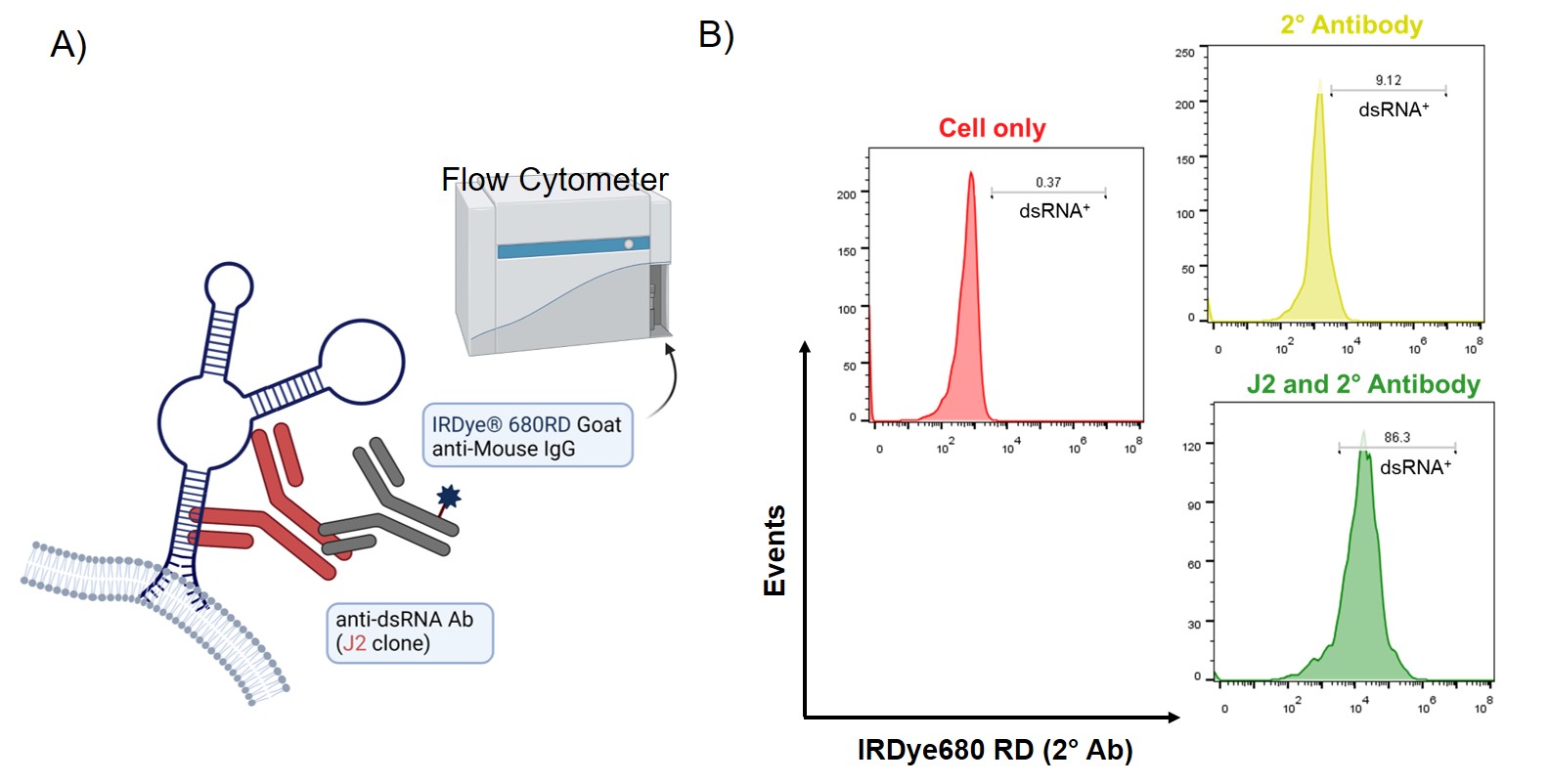 Figure 2: A) Schematic illustration of the binding between the anti-dsRNA antibody (J2) and membrane-bound dsRNA on the cell surface. B) Flow analysis of HEI-OC1 cells stained with the J2 antibody. Gated region represents high J2 binding. The experiments were conducted in duplicates.