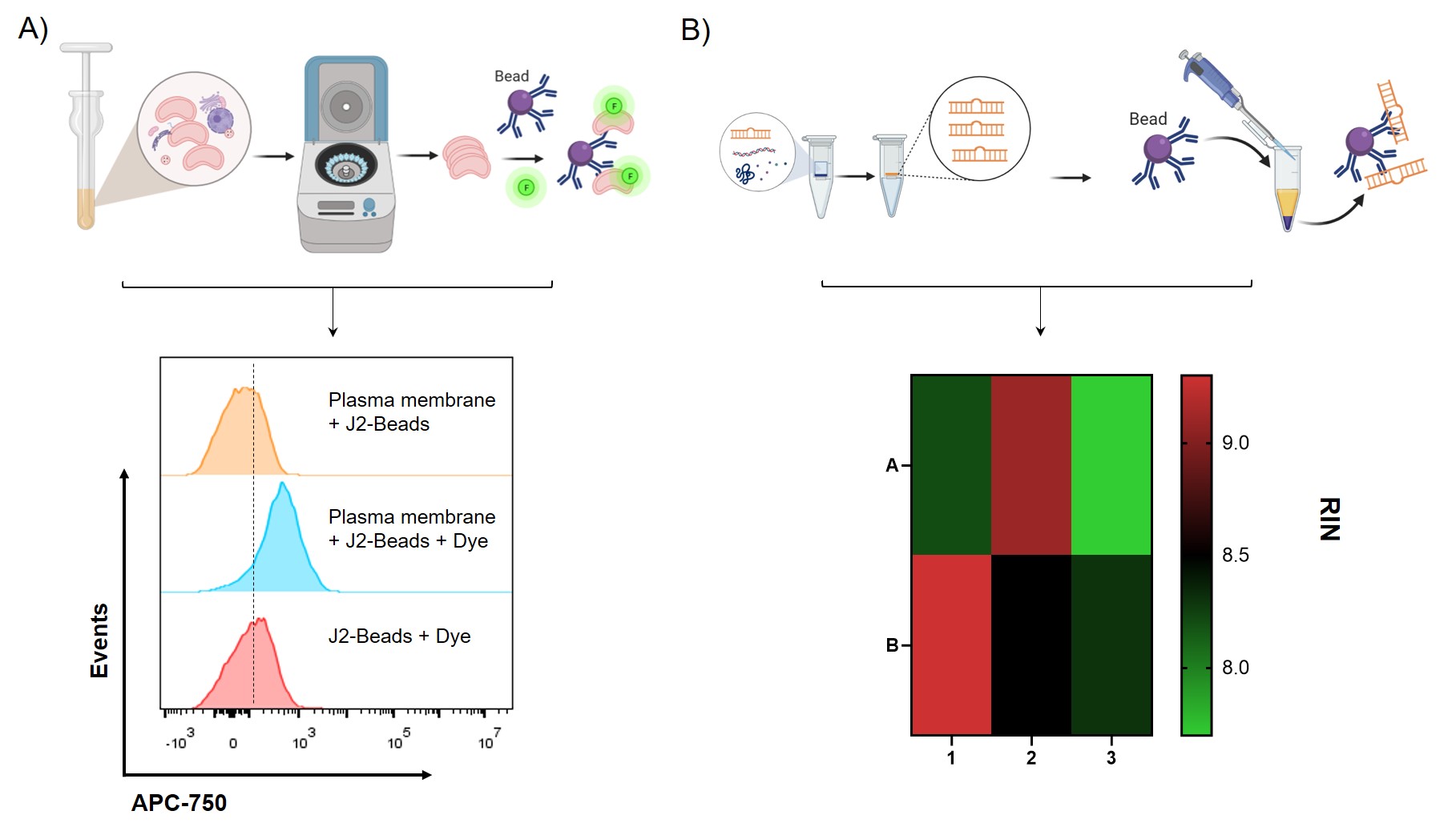 Figure 3: A) Schematic illustration of purification and analysis of plasma membrane immobilized on the anti-dsRNA J2 antibody modified Dynabeads. The resulting flow histogram of plasma membrane captured by J2-beads analyzed by FlowJo. The plasma membrane was labeled with dye that react with amine groups on the membrane. B) Schematic illustration of RNA extraction process and the resulting RNA quality (RNA integrity number by Eukaryote Total RNA PICO Bioanalyzer 2100) of dsRNA before and after J2 immunoprecipitation followed by the schematic protocol. 1-3 represents whole cell, plasma membrane, cytoplasm respectively. A is after J2 immunoprecipitation, representing dsRNA and B is before J2 immunoprecipitation, total RNA.