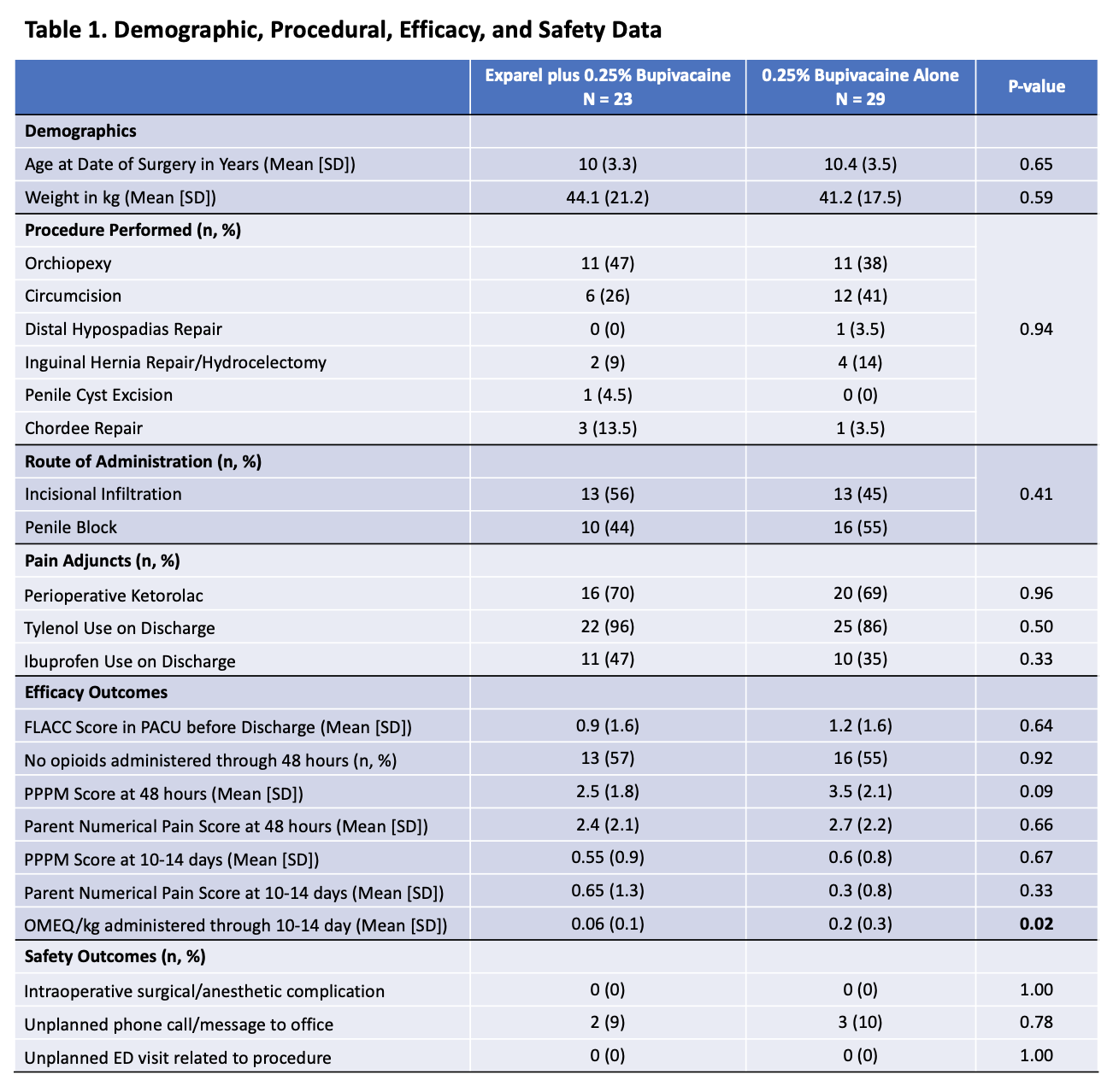 Introduction: Long-acting liposomal bupivacaine (Exparel) was approved for children >6 years old however it has not been evaluated in children undergoing urologic surgery. We report preliminary safety and efficacy data of Exparel plus bupivacaine vs. bupivacaine alone for incisional infiltration or penile block in pediatric patients undergoing ambulatory urologic surgery as part of a randomized trial. Methods: The study is an IRB-approved prospective, single-blinded trial randomizing patients 6-18 years old 1:1 to receive Exparel plus 0.25% bupivacaine (experimental) vs. 0.25% bupivacaine alone (control) during ambulatory urology procedures (NCT04826484). Patients received Tylenol and Ibuprofen prescriptions and a rescue prescription of 3-5 doses 0.1 mg/kg Oxycodone. Efficacy endpoints include percent requiring no opioids within 48hr and 10-14d, parents’ postoperative pain measure (PPPM) scores at 48hr and 10-14d, and oral morphine equivalents (OMEQ) per kg given through 10-14d. Results: A total of 52 patients (29 control, 23 experimental) have been enrolled. Demographic, procedural, efficacy, and safety data are summarized in Table 1. There was no difference in percentage of patients requiring no post-operative opioids through 48hr (57% vs 55%, p=0.92). There was no difference in mean FLACC score in PACU (0.9 vs 1.2, p=0.64), PPPM score at 48hr (2.5 vs. 3.5, p=0.09) or PPPM score at 10-14d (0.55 vs. 0.6, p=0.67). The experimental arm had significantly reduced OMEQ/kg at 10-14d (0.06 vs. 0.2, p=0.02). However, OMEQ/kg utilization was low and limited to the 48hr post-op period in both arms. There were no intraoperative complications and similar use of perioperative Ketorlac between arms. Roughly 10% of patients in both arms had an unplanned phone call or message to the office (all related to swelling). No patients had unplanned presentation to the emergency department. Conclusions: This prospective, single-blinded randomized trial is the first to evaluate Exparel in pediatric patients undergoing urologic surgery. We demonstrate that albeit safe, the addition of Exparel to 0.25% bupivacaine did not improve validated pain scores or opioid-free rate at 48 hours. Formal assessment of efficacy and safety pending trial accrual. SOURCE OF Funding: Internally funded