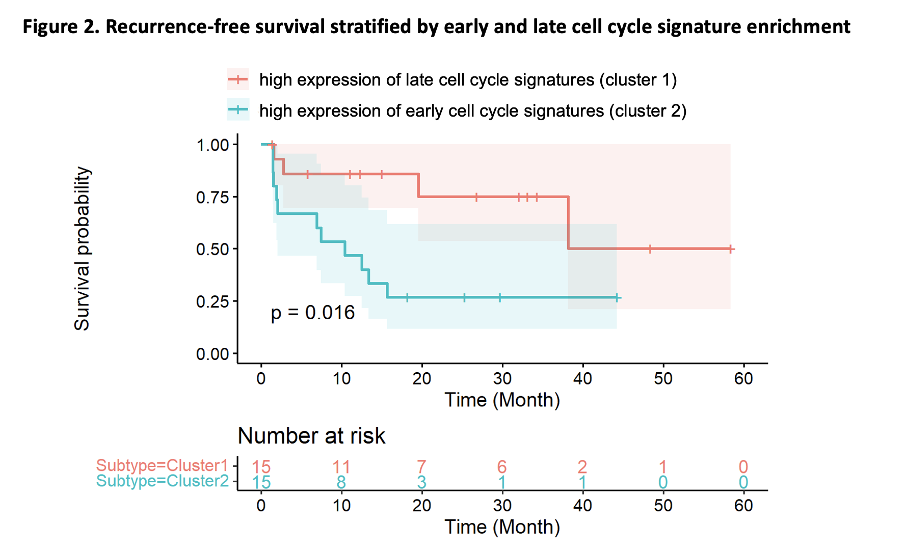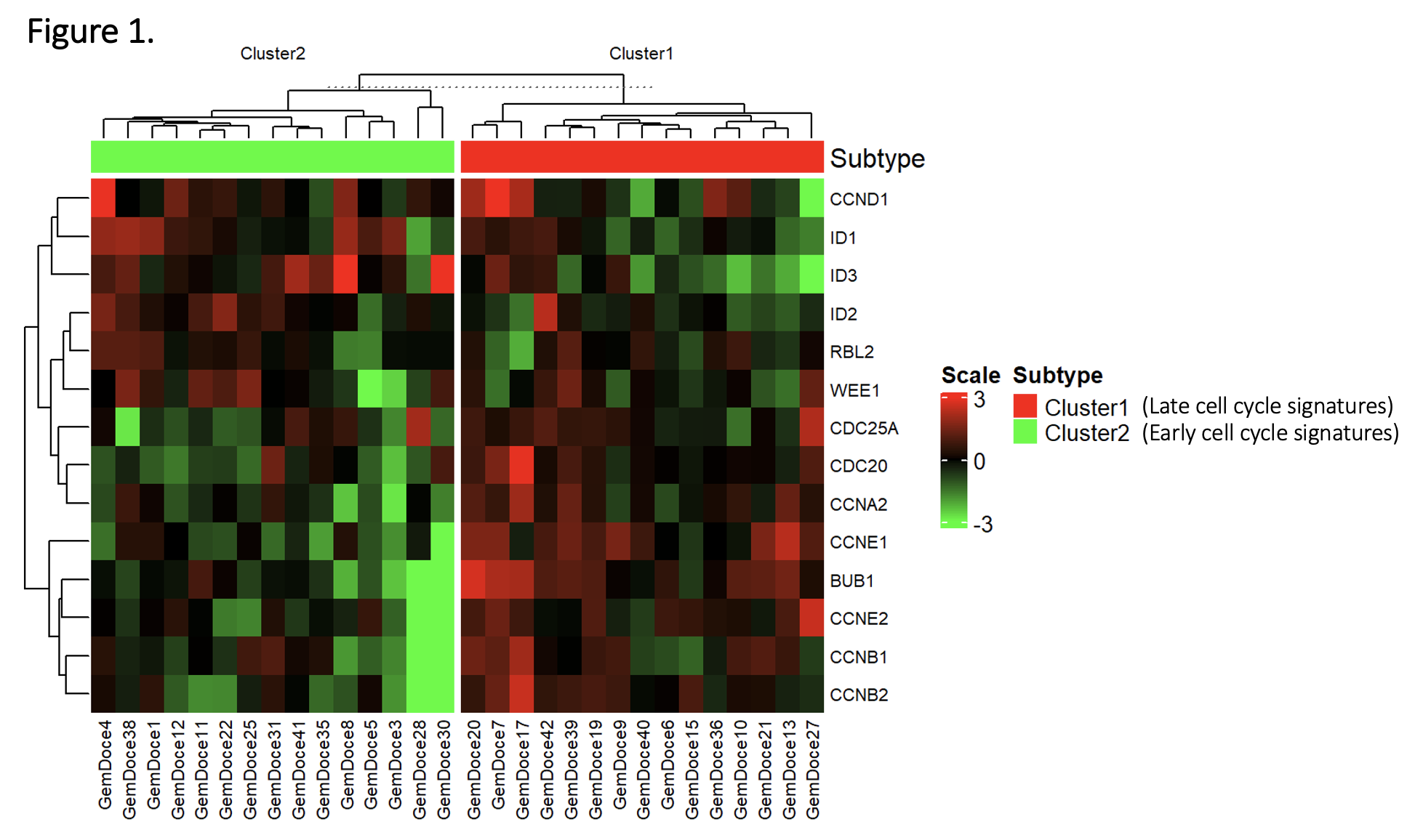 Introduction: Patients with BCG-unresponsive non-muscle invasive bladder cancer (NMIBC) are commonly treated with intravesical gemcitabine and docetaxel chemotherapy (GEMDOCE). However, studies evaluating biomarkers of GEMDOCE response in BCG-unresponsive NMIBC have been limited. Docetaxel is a microtubule-stabilizing agent that induces cell cycle arrest and apoptosis through mitotic catastrophe. We evaluated whether early and late cell cycle signatures were associated with GEMDOCE response in BCG-unresponsive NMIBC tumors. Methods: We performed a retrospective study of patients with BCG-unresponsive NMIBC who underwent intravesical GEMDOCE. Monthly maintenance therapy was given for 52% of patients with a 3-month complete response. RNAseq and DNA panel sequencing were performed on FFPE tissues from pre-treatment TURBT samples. Gene set variation analysis (GSVA) was performed to calculate gene set enrichment scores with cell cycle and immune signatures. Cluster analysis was performed to assess whether cell-cycle signatures and other gene signatures were associated with response and recurrence-free survival. Results: A total of 30 patients with BCG-unresponsive NMIBC were included, of whom 63% (19) experienced disease recurrence. Cluster analysis with cell cycle signatures yielded 2 clusters with high expression of either late (cluster 1) or early (cluster 2) cell cycle signatures (Figure 1). Tumors enriched with late cell cycle signatures showed significant recurrence-free survival benefit compared to tumors with high expression of early cell cycle signatures (Figure 2). TP53 alterations were enriched in cluster 1 which demonstrated a clinical benefit from GEMDOCE. In contrast to prior work from our lab on BCG-treated tumors, response in GEMDOCE-treated tumors was not associated with immune signatures. Conclusions: These early data suggest that there may be molecular signatures that stratify patients with BCG-unresponsive NMIBC treated with GEMDOCE. Further expansion of these cohorts in both BCG-naïve and BCG-unresponsive cohorts is ongoing. SOURCE OF Funding: NA