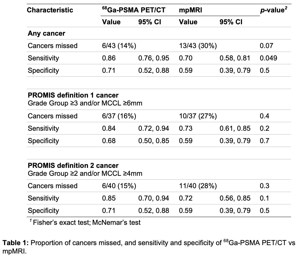 Introduction: Local salvage therapy for men with localized radiorecurrent prostate cancer requires accurate diagnosis of intra-prostatic lesions. PSMA PET/CT is increasingly used for whole-body restaging, but its ability to localize intra-prostatic lesions is unclear. Using a histopathological reference, we compared the diagnostic accuracy of 68Ga-PSMA PET/CT to multiparametric MRI (mpMRI) for identifying intra-prostatic radiorecurrent cancer. Methods: This is a single-center retrospective series (2017-2022) of men with a rising prostate-specific antigen post-radiotherapy, who underwent both index tests (68Ga-PSMA PET/CT and mpMRI) and a systematic and/or targeted biopsy (reference test). PET/CTs were analyzed in sextants by a single, blinded expert reader using a 5-point Likert score, with scores =3 indicating a suspicious scan. mpMRIs were designated suspicious or non-suspicious. Sensitivity and specificity of PET/CT vs mpMRI were compared using McNemar’s test. 3 cancer definitions were studied: any cancer; Grade Group =3 and/or maximum cancer core length (MCCL) =6mm (PROMIS definition 1); and Grade Group =2 and/or MCCL =4mm (PROMIS definition 2). Analyses were performed at the hemi-gland level using cluster bootstrapping with 10,000 resamples. Results: Of 70 eligible hemi-glands (35 men), 43 (61%) had any cancer on biopsy. PET/CT missed 6 cancers (14%) and mpMRI missed 13 (30%; p=0.07). 10 mpMRI-undetected cancers were detected by PET/CT. PET/CT had significantly higher sensitivity (0.86, 95%CI 0.76-0.95) versus mpMRI (0.70, 95%CI 0.58-0.81; p=0.049). However, specificity was not significantly different (PET/CT 0.71, mpMRI 0.59; p=0.5) (Table 1). For PROMIS definitions 1 and 2, PET/CT missed 6/37 (16%) and 6/40 (15%) cancers, respectively. mpMRI missed 10/37 (27%) definition 1 and 11/40 (28%) definition 2 cancers, of which 7 and 8 were detected by PET/CT, respectively. For both definitions, sensitivity and specificity did not significantly differ (Table 1). Conclusions: 68Ga-PSMA PET/CT had good sensitivity that improved upon mpMRI for identifying intra-prostatic radiorecurrent cancer of any grade or length. Furthermore, most mpMRI-undetected cancers were detected by PET/CT. Using both together may optimize diagnosis of intra-prostatic disease. SOURCE OF Funding: Nil