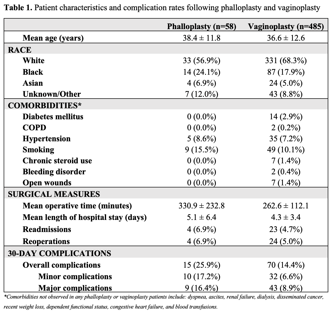 Introduction: Dramatic advances have occurred in phalloplasty (PLP) and vaginoplasty (VGP) for gender dysphoria. However, there is need for better characterization of patient demographics and surgical outcomes to aid in patient selection, counseling, and quality improvement. Methods: PLPs and VGPs performed from 2006-2020 were identified in National Surgical Quality Improvement Program (NSQIP) database. Major (e.g. reintubation, septic shock, etc.) and minor complications (e.g. urinary tract infection, superficial wound infection, etc.) were categorized by NSQIP. Frailty was based on the modified frailty index (NSQIP-mFI-5), a validated score including points for diabetes, functional status, obstructive pulmonary disease, heart failure, and hypertension. Pre-operative(op) morbidity probabilities were derived from the NSQIP morbidity probability, which uses hierarchical regression analysis on patient-specific factors. Results: 58 PLPs and 485 VGPs were identified. The mean patient age was 38.4±11.8 years for PLP and 36.6±12.6 for VGP. The average op time for PLP and VGP was 331 and 263 minutes, and the average LOS was 5.1 days and 4.3 days, respectively. The overall 30-day complication rate for PLP was 26%, with 17% of total patients experiencing minor complications and 16% experiencing major complications. The overall, minor, and major complications rates for VGP were 14%, 7%, and 9%. Readmissions and reoperations occurred in 7% PLP and 5% VGP patients. No deaths occurred in either group within 30 days. NSQIP-mFI-5 scores =0.2 versus a score of 0 were not predictive of 30-day complications, op time, or LOS for either procedure. For VGPs, higher NSQIP-mFI-5 scores were numerically associated with higher complication rates (OR 2.02, 95% CI 0.94-4.09, p=0.072). When comparing NSQIP morbidity probabilities of =10% vs <10%, this score was predictive of 30-day complications for both PLP (OR 4.0, 95% CI 1.1-19.6, p=0.038) and VGP (OR 2.46, 95% CI 1.4-4.3, p<0.001). NSQIP morbidity probability =10% was also predictive of extended LOS for PLP patients (6.3±1.3 vs 2.9±0.8, p=0.03). Conclusions: This study described the patient characteristics and complication rates of PLP and VGP. The NSQIP preop morbidity probability is an effective predictor of surgical complications and is a better predictor than the NSQIP-mFI-5. SOURCE OF Funding: n/a