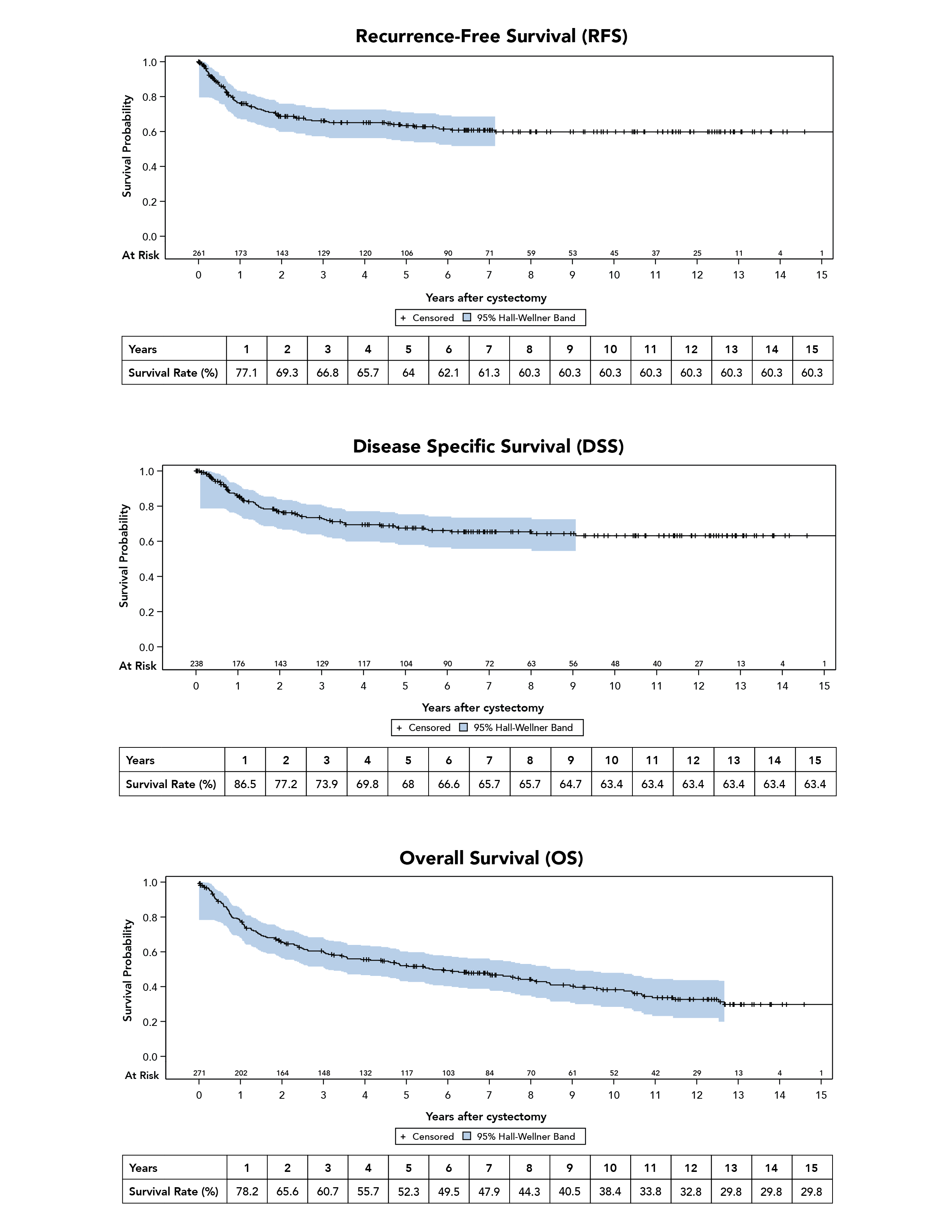 Introduction: We aimed to report the long-term follow-up of bladder cancer patients who underwent robot-assisted radical cystectomy (RARC) 15 years ago or more utilizing the International Radical Cystectomy Consortium (IRCC) database. Methods: Patients who underwent RARC before 2007 were identified. Kaplan-Meier method was used to depict recurrence-free (RFS), disease-specific (DSS) and overall survival (OS). Multivariate COX regression model was used to identify the variables associated with RFS, DSS and OS. Results: 271 patients were identified. Median follow-up time is 10 year (IQR 6-13) years. Twenty-five patients (10%) received neoadjuvant chemotherapy, 75 (28%) received neobladder, 117 (43%) had pT3/T4 and 63 (23%) had pN+ disease. RFS, DSS and OS were 60%, 63% and 30% at 15 years, respectively (Figure). Multivariate analysis showed that pT stage and pN+ remain the determinants of survival outcomes (Table). Conclusions: Locally advanced disease remains the main determinant of survival after RARC. SOURCE OF Funding: Vattikuti Foundation