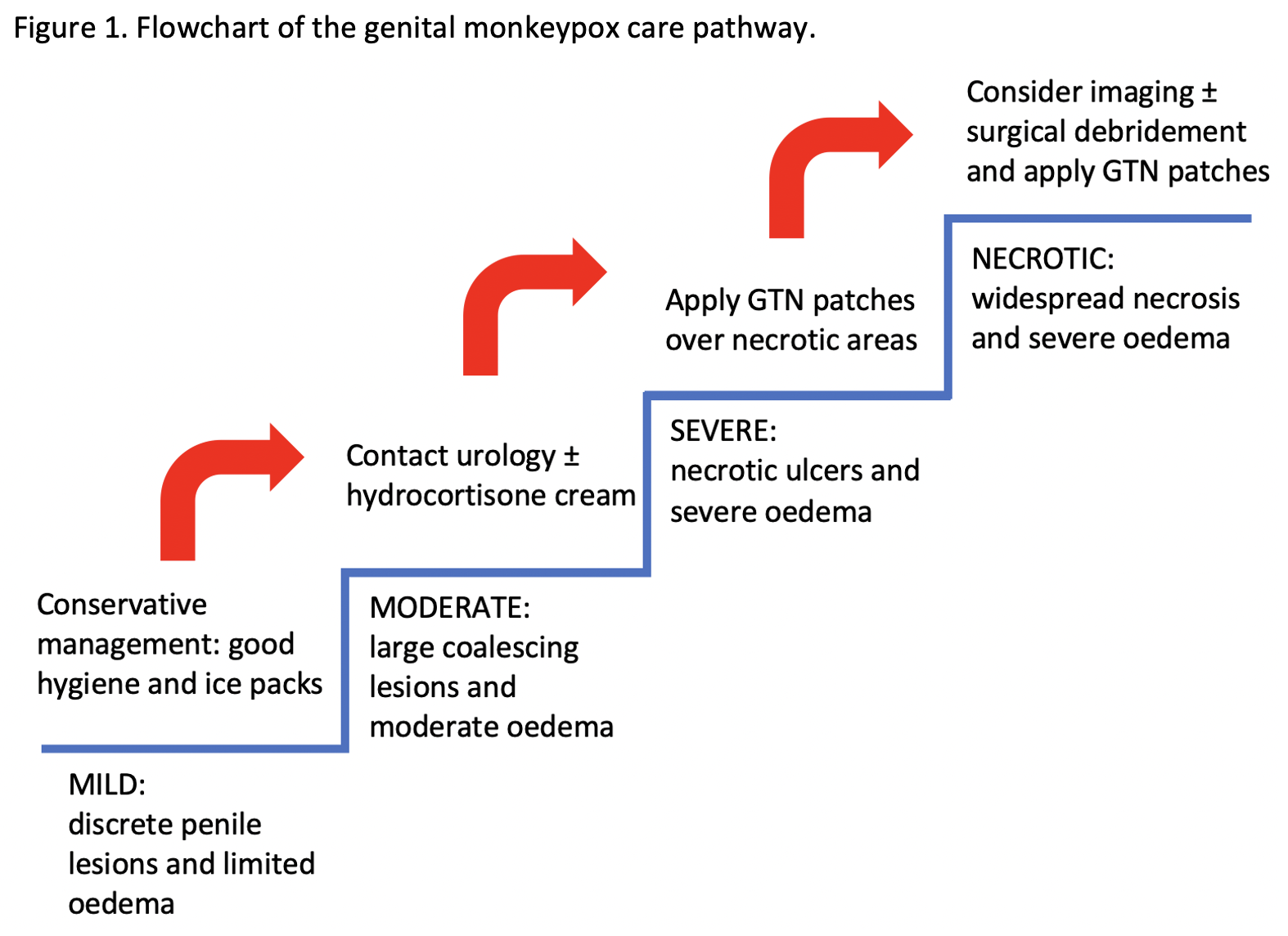 Introduction: Monkeypox is a viral illness affecting predominantly gay, bisexual and other men having sex with men. The rapid progression of the recent outbreak meant genital manifestations preceded any guidelines for cases with urological symptoms. This study aims to develop an empirical care pathway for patients presenting with penile and scrotal symptoms secondary to monkeypox. Methods: From May to September 2022, 198 patients with monkeypox who presented to a tertiary referral hospital were assessed for genital involvement by the infectious disease team, with the involvement of a urologist. Of these, 19 patients (10%) were admitted with genital lesions and were treated in an isolation ward with full personal protection equipment (PPE) in use. Symptoms requiring urological input were present in 8 individuals (4%). The mean time from the onset of symptoms to resolution was 25.3 (range 9-63) days. Based on the management of these patients, an empirical care pathway for genital monkeypox was developed. Results: Four stages of genital monkeypox were observed (Figure 1). Limited penile oedema and discrete lesions should be managed conservatively with analgesia, cold compresses and elevation for swelling control. Patients with moderate oedema, paraphimosis and large coalescing ulcers should be considered for a topical 1% hydrocortisone cream to reduce the inflammation. In severe oedema with necrotic ulcers glyceryl trinitrate (GTN) patches are crucial to improve the vascularization of the necrotic ulcers on the penis. Cases of widespread necrosis and oedema may require imaging to assess the need for surgical debridement. GTN patches require daily changes for tissue salvage. Catheterization should be guided by the extent of oedema, the presence of paraphimosis and lesions close to the external urethral orifice. Conclusions: Monkeypox cases presenting through lesions on the penis and scrotum often require urological management to reduce penile oedema and prevent catheterisation. All admitted patients require isolation with full PPE. The initial stages of the infection should be managed conservatively with cold compresses, elevation and analgesia. Patients with advanced genital symptoms can benefit from the early use of topical steroid creams and GTN patches applied over the necrotic areas to reduce swelling and aid perfusion. SOURCE OF Funding: N/A