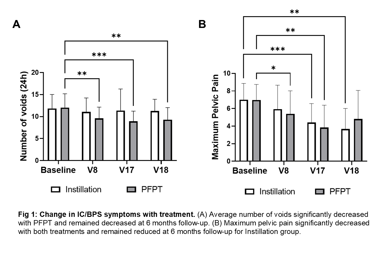 Introduction: Interstitial cystitis/bladder pain syndrome (IC/BPS) symptoms appear bladder related, though little solid evidence exists linking IC/BPS symptoms to dysfunctional bladder epithelium unless ulcers are present. Growing evidence suggests IC/BPS may be a more diffuse syndrome. The study objective is to compare IC/BPS symptom improvement in pelvic floor versus bladder directed therapies. Methods: Women 18 to 85 years with history of IC/BPS were randomized to one of two treatment arms: 1. Pelvic Floor Physical Therapy (PFPT), 2. Bladder directed instillation of lidocaine, heparin sulphate, sodium bicarbonate, and Kenalog. All participants received twice weekly treatments for 8 consecutive weeks. Symptom improvement was assessed using 3-day voiding diary, pain assessment, and validated questionnaires: global response assessment (GRA), Interstitial cystitis symptom index (ICSI) and Interstitial cystitis problem index (ICPI), at baseline, treatment mid- and end-points (V8 and V17), and 6 months follow-up (V18). Statistical analysis was performed using ANOVA followed by Dunnett’s multiple comparison. Results: 31 women were enrolled and randomized to PFPT (n=15) or Instillation (n=16) arm with average age of 46.8 and 48.7 respectively. By end of treatment 67% in PFPT versus 54% in instillation group reported significant improvement of symptoms (GRA). Urinary frequency was significantly reduced in PFPT group at all time points (Fig 1) and was resolved or improved in 75% of patients in PFPT compared to 33% in instillation group. Both treatments significantly improved Maximum pelvic pain, but reduction in pain was no longer significant in PFPT group by V18 (Fig 1). Pain Catastrophizing Scale scores followed the same trend. Urgency did not improve with either treatment. ICSI and ICPI scores were significantly reduced by V8 and remained constant up to V18. No severe adverse events were reported. Four patients developed urinary tract infections during treatment, 1 in PFPT and 3 in instillation group. Conclusions: Both treatments significantly improved IC/BPS symptoms, with patients in PFPT reporting higher GRA scores and frequency improvement. In contrast, instillation appeared superior in reducing maximum pelvic pain long-term. SOURCE OF Funding: DoD clinical research grant (W81XWH 16-10)
