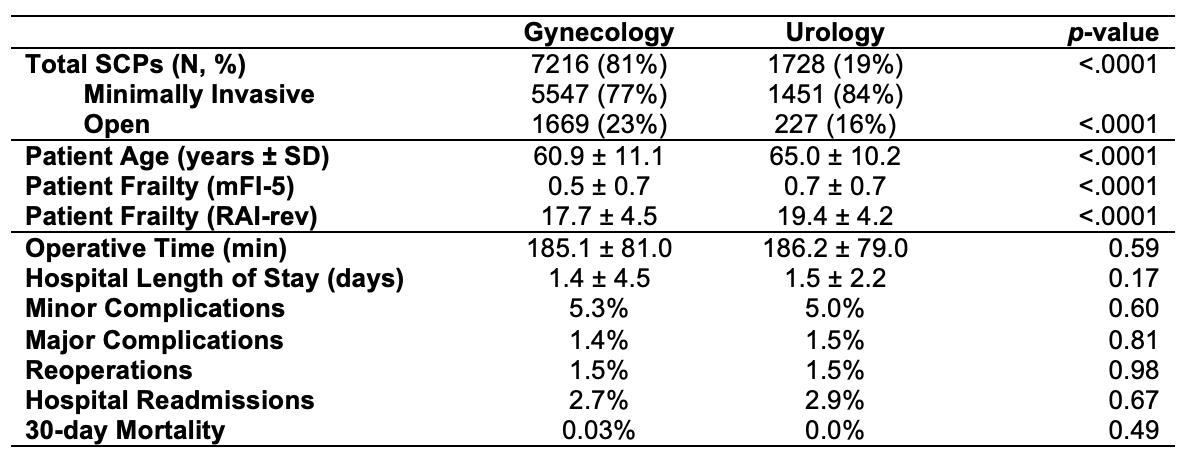 Introduction: Sacrocolpopexies (SCP) are performed by both urologists and gynecologists; however, the majority are performed by gynecologists. We aim to elucidate if there is a difference in patient demographics and surgical outcomes based on surgeon specialty. Methods: Open and minimally invasive SCPs performed between 2006-2020 were identified inthe American College of Surgeons National Surgical Quality Improvement Project (ACS-NSQIP) database using CPTs 57280 and 57425. Frailty was calculated using the NSQIP modified frailty index (mFI-5), a previously validated 5-item score including points for diabetes, functional status, chronic obstructive pulmonary disease, heart failure, and hypertension, and the revised surgical Risk Analysis Index (RAI-rev), a validated score which accounts for patient comorbidities, age, and functional status. Univariate analysis was performed using student’s t-test and Pearson’s chi-square to compare operative parameters, patient frailty and demographics, surgical outcomes, and mortality. Results: We identified 8,944 SCPs from 2006-2020. Gynecology performed 81% of cases, and urology performed 19% (p <.001). Urologists tended to perform more minimally invasive cases compared to gynecologists (84% vs 77%, p<.001). Between urologists and gynecologists, there were no significant differences in surgical outcomes, minor complications (surgical site infection, pneumonia, urinary tract infection, bleeding, or acute kidney injury), major complications (deep vein thrombosis, stroke, renal failure, myocardial infarction, pulmonary embolism, septic shock, deep wound infections, or cardiac arrest), 30-day reoperations, 30-day hospital readmissions, nor 30-day mortality. However, urology patients tended to be older (65 vs 61 years, p<.001) and frailer by mFI-5 (0.7 vs 0.5, p<.001, higher score indicating more frailty) and RAI-rev (19.4 vs 17.1, p<.001, higher score indicating more frailty). Conclusions: We found no difference in 30-day surgical outcomes for SCPs performed by urologists compared to gynecologists. However, urologists tend to perform more minimally invasive procedures and operate on older, more frail patients. This finding highlights differences in practice patterns between two specialties and warrants further studies. SOURCE OF Funding: n/a