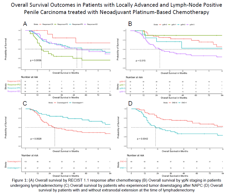 Introduction: The efficacy of neoadjuvant platinum-based chemotherapy (NAPC) in locally advanced Penile Squamous Cell Carcinoma (PSCC) has been demonstrated in prior small studies, leaving clinicians with scant evidence-based guidance. Thus, we aimed to provide evidence on real-world outcomes of patients with PSCC who received NAPC prior to surgical resection. Methods: Patients who had undergone NAPC prior to surgical resection for PSCC were included from ten centers. Patients had locally advanced (cTany, cN+), non-metastatic (M0) disease. Clinicopathologic data, chemotherapeutic agents utilized including TIP (Paclitaxel - Ifosfamide - Cisplatin), surgical modalities, and clinicopathologic outcomes were assessed. The primary outcome was overall survival (OS), analyzed using Kaplan-Meier Method and compared using Cox Proportional Hazard Modelling. The secondary outcome was progression-free survival (PFS). Response was determined via best overall response measured with RECIST 1.1 criteria following completion of NAPC. Results: 167 patients with PSCC treated with NAPC were included, 137 (84%) of whom received TIP. 92 (55%) patients died during follow up, and the median follow up for survivors was 57 months. The median OS was 42.0 months, while the median PFS was 17.0 months. After NAC, 22% had progressive disease (PD), 20% had stable disease, 47% had partial response, and 11% had complete response, with median OS of 16 months, 51 months, 56 months, and 119 months, respectively (p < 0.01). Predictors for OS and RFS included lymphovascular invasion, positive number of lymph nodes, extranodal extension, downstaging after chemotherapy, best overall response, and ypN status. Figure 1 demonstrates OS outcomes by RECIST best response after chemotherapy, presence of downstaging after NAPC, ypN stage, and presence of extranodal extension. Conclusions: NAPC is effective in patients with lymph node metastases from PSCC. This study represents the largest conglomeration of multi-institutional penile carcinoma patients treated with upfront cisplatin based therapy, and provides further supportive data for multimodal therapy for advanced penile cancer patients while prospective clinical trials complete accrual. SOURCE OF Funding: NA