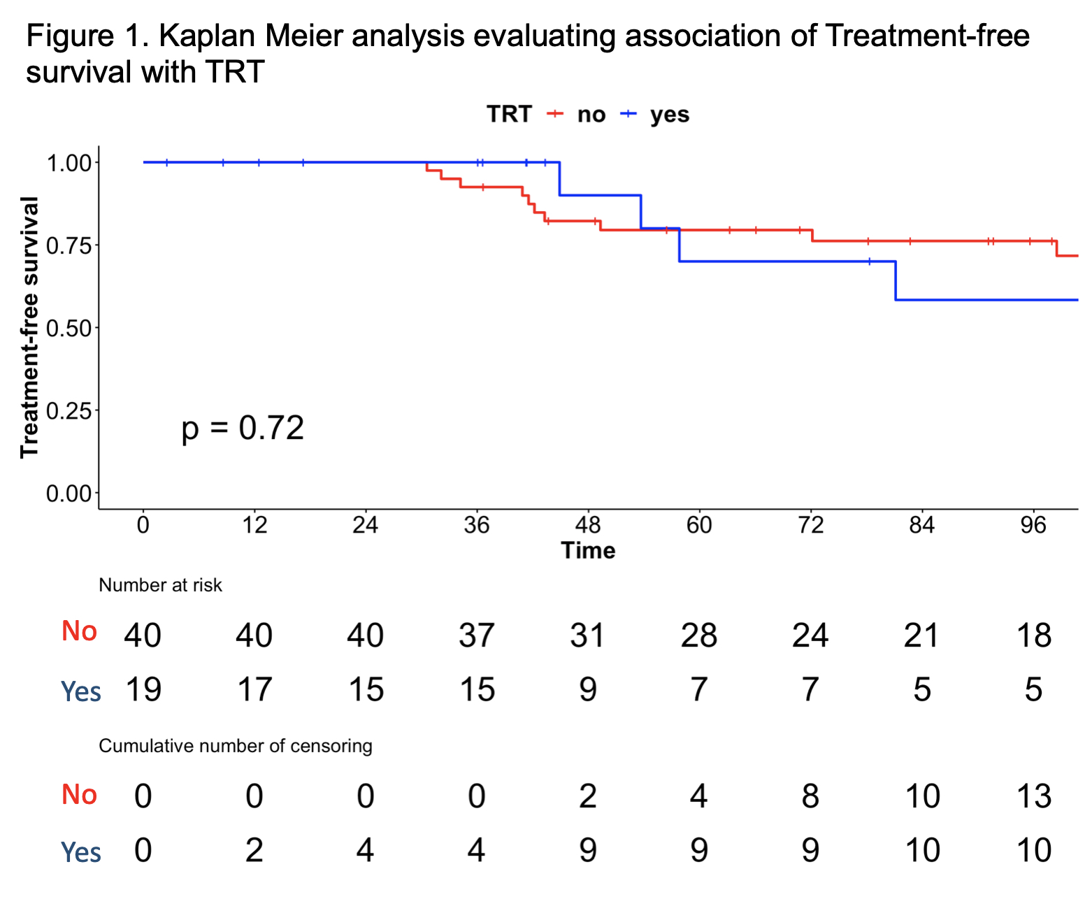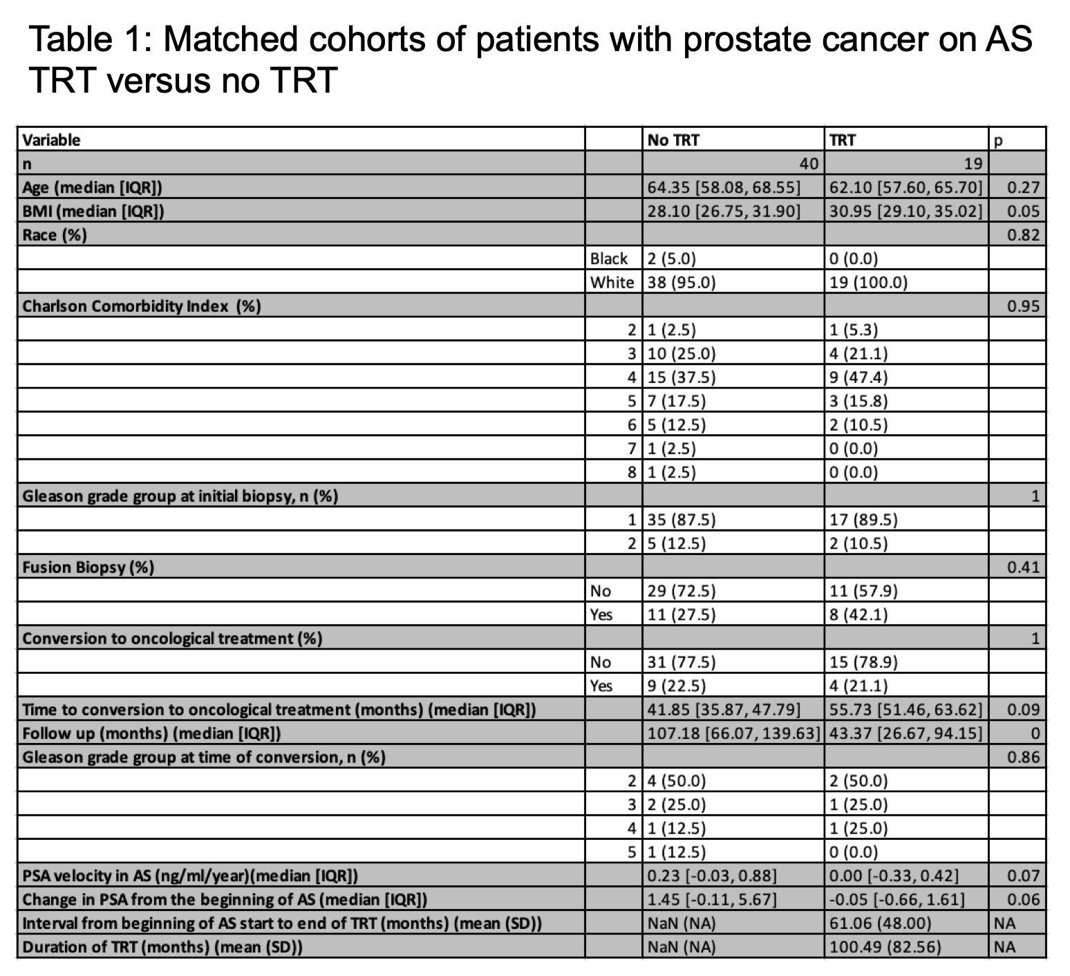 Introduction: We aimed to evaluate the impact of testosterone replacement therapy (TRT) in patients with localized prostate cancer who elected active surveillance (AS). Methods: A retrospective review of our AS database was performed. Patients who received TRT while on AS were identified. A cohort of patients who underwent AS while not on TRT was matched in a ratio of 1:2. Both groups were compared. Kaplan Meier analysis and log-rank test were performed to compare treatment-free survival. Statistical significance was defined as p = 0.05. Results: 23 (2%) patients who underwent TRT while on AS were identified. Two patients elected discontinuation of TRT and 2 were lost to follow up. Median follow-up was 91 months. Nineteen patients in the TRT group were matched to 40 patients without TRT. There was no significant difference in conversion to treatment (21% vs 22%, p=1.00), time to conversion to treatment (56 vs 42 months, p=0.09) or the change in PSA while on AS (-0.05 vs 1.45, p=0.56) (Table 1). Kaplan Meier analysis showed no significant difference in treatment-free survival between the 2 groups (log rank p>0.05) (Figure 1). Univariate analysis showed that Age, CCI, receipt of TRT, Gleason grade at initiation of AS or history of fusion biopsy were not associated with conversion to treatment. Conclusions: TRT was not associated with conversion to treatment in this matched analysis among patients with localized prostate cancer on AS. Despite limitations, to our knowledge, this study has the longest follow-up in patients receiving TRT while on AS. SOURCE OF Funding: None