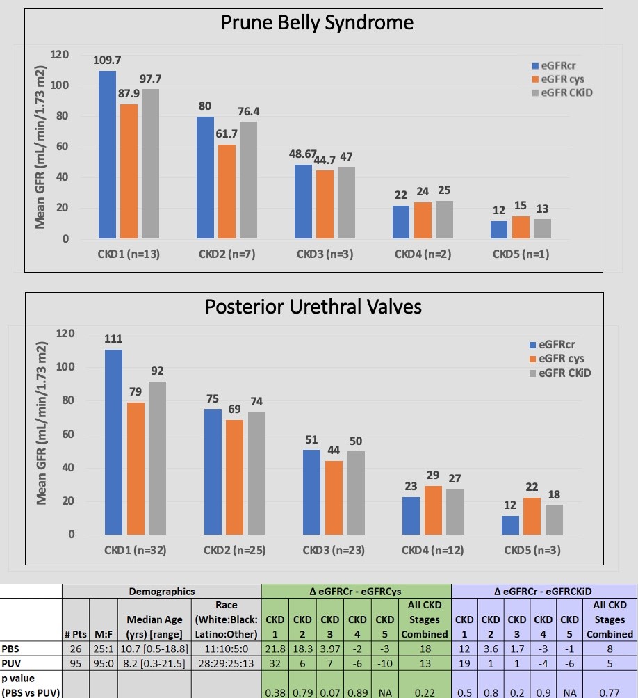 Introduction: In prune belly syndrome (PBS), prior comparison of estimated glomerular filtration rate (eGFR) with calculators using creatinine (Cr) and/or Cystatin C (Cys) showed lower mean eGFR with Cys-based calculators than with the “Bedside Schwartz” Cr-based calculator (eGFRcr) in Chronic Kidney Disease (CKD) 1 and 2. As abdominal skeletal muscle paucity in PBS could reduce serum Cr, we hypothesized the differences in mean eGFRcr and eGFR by Cys-based calculators (denoted as ?) will be greater in PBS compared to posterior urethral valves (PUV), with intact musculature. Methods: A 2014-2021 retrospective ICD-10 search identified PBS and PUV patients with labs and height without neuromuscular disorders or renal replacement. eGFRcr, eGFRcys and creatinine-cystatin C-based GFR (eGFR-CKiD) were calculated. CKD stages were assigned by eGFRcr. ? eGFRcr, eGFRcys, and eGFR-CKiD between PBS and PUV were compared with t-test. Those with normal Cr and/or Cys but who had CKD by eGFR calculators were identified. The proportion of changes in CKD staging by each calculator was compared with chi-square or Fishers exact test. Results: 95 PUV and 26 PBS patients were analyzed (Fig 1). ? eGFRCr and eGFR with Cys-based calculators by CKD stage or by all CKD stages combined were not different between PBS and PUV. By all CKD stages combined, ? eGFRcr and eGFRcys was 18 and 13 mL/min/1.73m2 in PBS and PUV, respectively (p=0.22) and ? eGFRcr and eGFR-CKiD was 8 and 5 ml/min/1.73m2 in PBS and PUV, respectively (p=0.71). Among patients with normal Cr and/or Cys, at least 25% had CKD2-3 by eGFR calculation. Changes in CKD stage by Cys-based calculators compared to eGFRcr were not significantly different between PBS and PUV (p >0.3). Upstaging was most frequent in PBS and PUV CKD1 and 2. Conclusions: Differences between eGFRcr and eGFR by Cys-based calculators in PBS and PUV patients were not significant, suggesting paucity of abdominal musculature in PBS may not account for the lower eGFRs observed using Cys-based calculators. In 25% of patients, normal Cr and/or Cys actually had CKD2-3, highlighting importance of eGFR calculation. Cys-based calculators upstaged, especially in CKD1 and 2. Cys-based eGFRs calculators should be considered for early identification of CKD in patients with congenital urologic abnormalities prone to renal dysfunction. SOURCE OF Funding: None