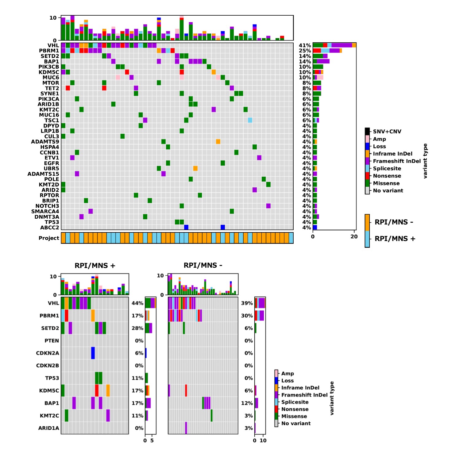 Introduction: The efficacy of adjuvant immune checkpoint inhibition has been reported recently for locally advanced clear cell renal carcinoma (ccRCC); however, further exploration is required to define optimal candidates for this strategy, who are at high risk for recurrence. In this study, we defined renal parenchymal infiltration or micronodular spread (RPI/MNS) in ccRCC and investigated its prognostic impact and genomic backgrounds. Methods: We retrospectively analyzed 333 M0 ccRCC patients treated with radical nephrectomy (approval # M2019-172 and M2021-272). Two pathologists evaluated the whole tissue sections of surgical specimens and performed the focused analysis on the tumor interface with normal renal parenchyma. Recurrence-free survival (RFS) was analyzed as an endpoint. Genomic DNA was extracted from tumor tissue in eligible cases (n=51), and variants were screened using a panel of 440 cancer-related genes. Results: Overall, =pT3a, WHO/ISUP grade 3-4, and microvascular invasion were observed in 107 (32%), 138 (41%), and 199 (60%) patients, respectively. Histological assessment revealed the variations of the tumor interface with normal renal parenchyma and identified the specific pattern at high risk for recurrence. This finding was defined as RPI/MNS, in whichcancer cells infiltrated or spread into the renal parenchyma by involving normal renal tissue and/or by forming micronodules. RPI/MNS was finally identified in 40 patients (12%). During the median follow-up of 6.0 years, 67 patients (20%) developed recurrence. On multivariable analysis, =pT3a, grade 3-4, and RPI/MNS were independently associated with shorter RFS; RPI/MNS showed the highest hazard ratio (4.63) followed by grade 3-4 (2.03) and =pT3a(1.99). 2y-RFS rates were 38% and 95% in patients with and without RPI/MNS, respectively. The genomic analysis revealed significantly different patterns of representative gene mutations in ccRCC (figure). Patients with RPI/MNS (n=18) had significantly more frequent mutations in SETD2 (28% vs. 6%) and TSC1 (17% vs. 0%) in comparison to those without RPI/MNS (n=33). Conclusions: RPI/MNS had a strong impact on recurrence after surgery with the background of aggressive genomic features in ccRCC. Adjuvant therapy may be recommended for patients showing RPI/MNS. SOURCE OF Funding: None