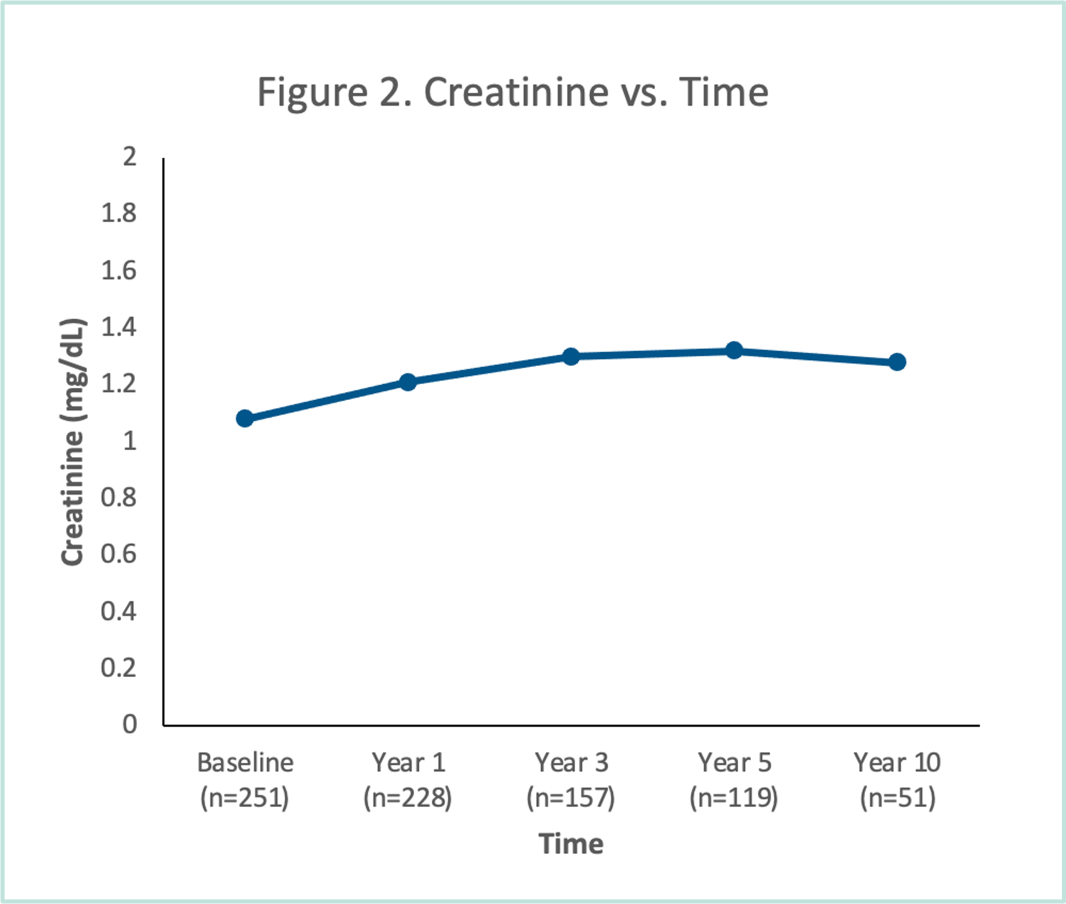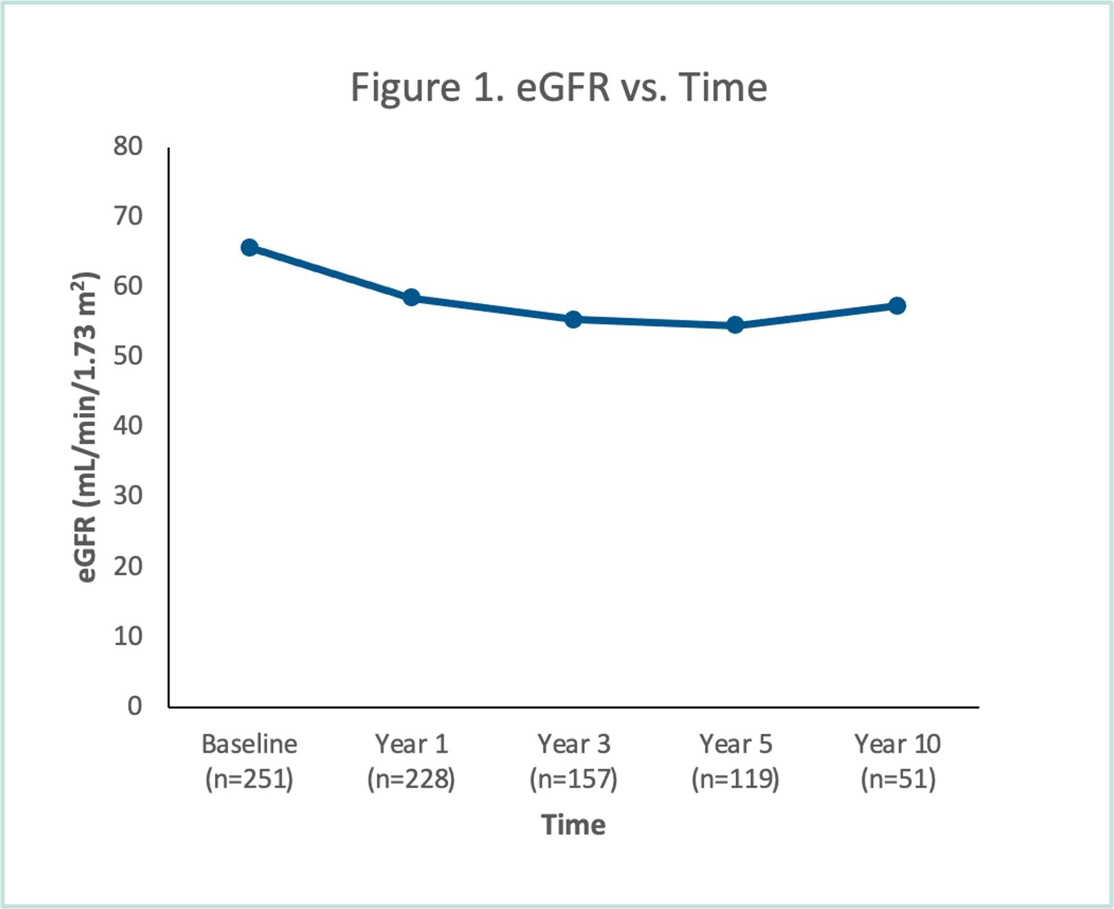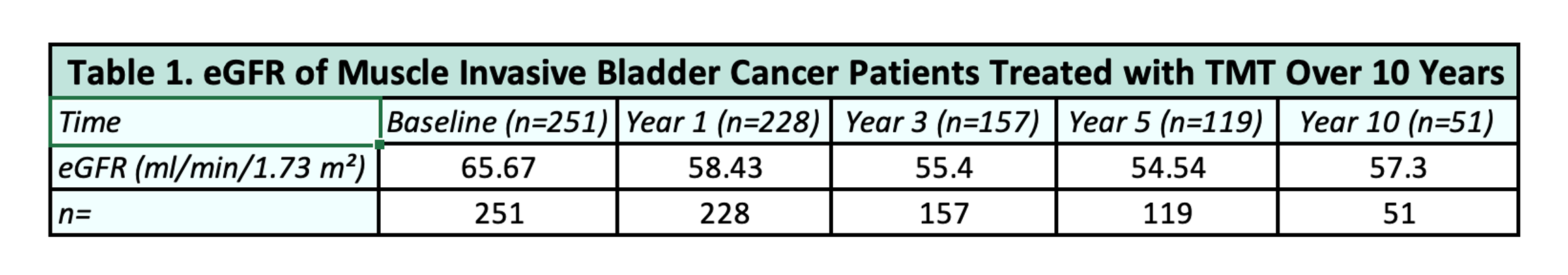 Introduction: Trimodal therapy (TMT) is a standard treatment option for select patients with muscle-invasive bladder cancer. The efficacy of TMT has been shown in several randomized trials; however, the long-term effect on renal function has not been investigated. Furthermore, various types of chemotherapy agents (ie. mitomycin, 5-FU, cisplatin) used during TMT are nephrotoxic. As many bladder cancer patients are elderly with significant medical comorbidities, data on long term renal function would aid in management. We sought to evaluate the change in renal function over 10 years in bladder cancer patients who have completed TMT. Methods: The Massachusetts General Hospital’s institutional TMT database was retrospectively reviewed to obtain baseline renal function (estimated GFR) at time of muscle-invasive bladder cancer (MIBC) diagnosis. The eGFR values were calculated using the CKD-EPI creatinine equation. Interval eGFR was obtained for years 1, 3, 5, and 10 after the date of bladder cancer diagnosis. Results: 287 patients undergoing TMT treatment for muscle invasive bladder cancer were reviewed. Patients were excluded due to incomplete TMT treatment or missing data, resulting in 251 eligible patients for evaluation of baseline mean eGFR. Median follow up was 4.56 years. Baseline mean eGFR was 65.67 mL/min/1.73. Mean eGFR for years 1, 3, 5, and 10 were 58.43 mL/min/1.73, 55.4 mL/min/1.73, 54.54 mL/min/1.73, and 57.3 mL/min/1.73, respectively. Conclusions: Renal function for bladder cancer patients undergoing TMT declined slightly after 1 year of follow up but remained stable for the remainder of the 10 years of follow up. Further studies are needed to identify predictors of renal decline and compare these results with the overall bladder cancer and general population. SOURCE OF Funding: n/a