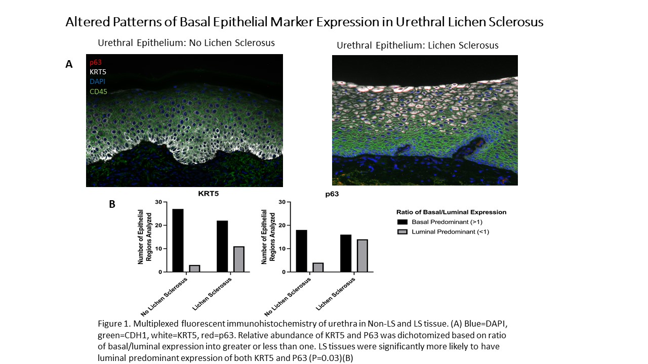 Introduction: Lichen sclerosus (LS) is an idiopathic chronic inflammatory disease of the genital epithelium resulting in fibrosis and severe urethral stricture disease in affected men. Epithelia are subdivided into basal, intermediate, and superficial cell layers which are defined by protein expression patterns. Loss of basal cell differentiation is a feature of other fibrotic disorders but have not been studied in the urethra or LS. The proteins keratin 5 (KRT5) and p63 have been reliably established as basal cell markers in urothelium. Therefore, we hypothesized that urethral epithelium affected by LS would have decreased basal expression of KRT5 and p63. Methods: Urethral tissue after urethral biopsy or urethroplasty was examined by a genitourinary pathologist to determine LS status. Using multiplexed fluorescent immunohistochemistry, KRT 5, CD45, p63, and DAPI were stained and three epithelial regions imaged per specimen. Using QuPath analysis software, the epithelium was segmented into basal and luminal compartments and relative abundance (RA) of each primary antibody was measured (number of positive cells/number of nucleated cells). RA was compared with respect to LS status and basal/luminal compartment using a Mann-Whitney U test. Results: We analyzed 14 slides (n=7 LS, n=7 non-LS). The RA of KRT5 and p63 positive cells were similar with respect to epithelial versus basal compartment and LS status. However, we noted a change in patterning such that LS tissues displayed a shift of KRT5 and p63 expression from the basal to the luminal epithelium. To quantify this, we compared the ratio of basal to luminal KRT5 and p63 expression and dichotomized this as “basal predominant” (>1) or “luminal predominant” ( <1). LS urethra were significantly more likely to have luminal predominant expression of p63 and KRT5 compared to non-LS (p=0.03, p=0.03) (Figure). Conclusions: We identified a change in expression pattern of basal epithelial markers (KRT5 and p63) in LS urethra. Altered epithelial differentiation is seen in other inflammatory diseases and may be implicated in the pathogenesis of LS. SOURCE OF Funding: K12DK100022NIH/NIDDK