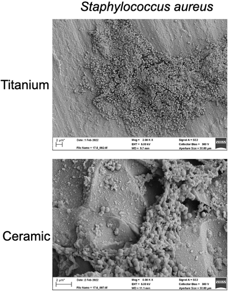 Introduction: Sacral neuromodulation (SNM) is effective for overactive bladder. A subset of SNM devices is associated with pain or infection requiring surgical removal. To understand the transition from the colonized (wherein bacteria are present but not pathological) asymptomatic to symptomatic (painful) states, we sought to determine microbial biofilm composition and qualities on devices, and association with clinical factors. Methods: Patients scheduled to undergo removal or revision of SNM devices were included. Devices were swabbed upon exposure during explantation, and samples and controls were subjected to 16s next-generation sequencing. Association between microbial diversity and pathogen abundance, and clinical variables was analyzed using t-tests and ANOVA. Clinically relevant isolates were isolated, identified, and cultured in vitro to assess reconstitution of biofilm formation in a continuous-flow stir tank bioreactor with coupons of different material types (titanium, ceramic, others), designed to mimic subcutaneous tissue with an indwelling device. Biofilm formation was assessed and compared using plate count assays and scanning electron microscopy. Results: 33 devices were analyzed. Escherichia was the most commonly detected pathogenic taxon. There was lower overall pathogen (p=0.02) and commensal microbial (p=0.04) abundance in devices explanted for pain (n=4). Clostridium (log2 fold change +4.5, p<0.001), Klebsiella (+4.0, p<0.001), and Bradyrhizobium (+3.9, p<0.001) were more abundant in device biofilms explanted for pain, whereas others were less abundant. Isolate strains consistently reconstituted biofilm formation in vitro, and there was differential biofilm formation both by strain (Staphylococcus aureus greatest) and material type (Figure). Conclusions: SNM devices harbored microbiota with a unique composition in the context of pain. Microbes isolated from SNM devices reconstituted biofilm in vitro and there was differential biofilm formation based on strain and medically-relevant material types. The methods and results open new avenues for investigating biochemical changes occurring during the transition from colonized asymptomatic to symptomatic states, and identifying preventative strategies. SOURCE OF Funding: SUFU Neuromodulation Research Grant