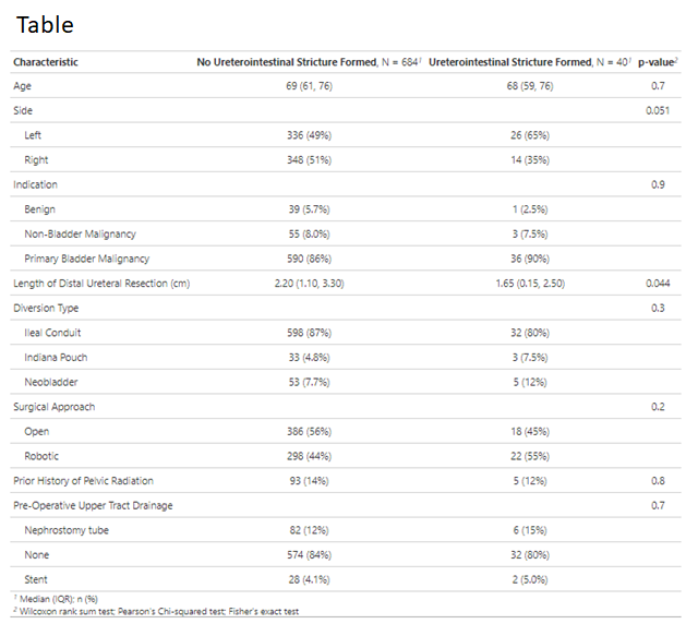 Introduction: Benign ureterointestinal anastomotic (UIA) strictures are a morbid complication following cystectomy with urinary diversion. Data from renal transplantation literature suggests that shorter ureters may result in fewer anastomotic strictures due to improved vascularization of the re-implanted segment. We evaluated whether length of distal ureteral resection may impact rates of UIA strictures in cystectomy patients. Methods: A database of patients who underwent cystectomy with urinary diversion from 2015 to 2022 was analyzed. All cases were performed by a single surgeon to control for variations in surgical technique. Distal ureteral resections were routinely sent for final pathology. Length of this resection was collected from pathology reports. Benign UIA strictures were confirmed with renal scintigraphy, antegrade nephrostogram, or endoscopic evaluation. Relationship between stricture formation and clinical parameters were assessed using T-tests, Chi-squared tests, and multivariable analysis. Results: A total of 362 patients underwent cystectomy with urinary diversion from 2015 to 2022. Of the cohort, 35 (9.6%) patients developed UIA strictures. Median time to stricture formation was 12.5 months (IQR 4-30). Of the 724 ureteral anastomoses among the 362 patients, 40 anastomoses developed benign strictures (6%). Median distal ureteral length resected was significantly longer among anastomosis that did not form a stricture (2.2 cm vs 1.65 cm, p=0.044, Table). Strictures more commonly formed on the left side, although this did not reach significance (65% vs 35%, p=0.051). Multivariable logistic regression adjusting for surgical approach, prior radiation, ureteral side, and urinary diversion type demonstrated longer distal ureteral resections were associated with a significantly lower risk of ipsilateral stricture formation (OR 0.74, 95% CI 0.58-0.94). Conclusions: The etiology of benign UIA strictures is multifactorial. Vascular compromise is a critical hypothesis. We found that longer distal ureteral resections (and thus shorter ureters) were associated with a significantly lower risk of stricture formation in cystectomy patients, consistent with renal transplantation data. SOURCE OF Funding: N/A