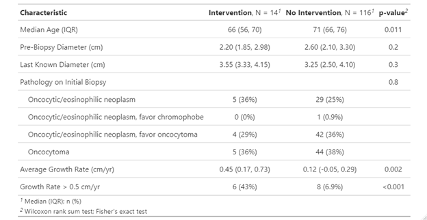 Introduction: Oncocytic renal neoplasms are slow growing tumors with minimal metastatic potential and may be ideal for management with active surveillance. However, few data are available describing surveillance outcomes or need for delayed intervention. The purpose of this study was to evaluate outcomes for patients diagnosed with renal oncocytic neoplasms treated with active surveillance. Methods: A prospectively maintained renal biopsy database was used to identify patients who were diagnosed with renal oncocytic neoplasms from 2006-2021. Baseline characteristics, treatment history, and follow-up imaging characteristics were collected as shown in table. Active surveillance (AS) was defined as at least 6 months with follow-up imaging. Results: 130 tumors in 122 patients were followed with surveillance imaging. Median follow-up was 50 months (IQR 28.3-83). A second biopsy was concordant in 19/20 patients (95%) with one patient found to have clear cell renal cell carcinoma (ccRCC) after the original biopsy had shown oncocytoma. Average growth rate of the entire cohort was 0.14 cm/year. 14 tumors (11%) had growth rates greater than 0.5 cm/year. Delayed intervention was utilized in 14 (11%) patients including 13 treated with percutaneous thermal ablation and one patient treated with nephrectomy (confirmatory biopsy demonstrated ccRCC). Median time from biopsy to delayed intervention was 37 months (IQR 13-40), which was more likely in younger patients (median age 66 versus 71, p = 0.01) with faster growing tumors (0.45 cm/year versus 0.12 cm/year, p=0.002) shown in Table. Pre-biopsy diameter was not associated with delayed intervention (2.2 cm vs 2.6 cm, p=0.2) nor was last known renal mass diameter (3.55 vs 3.25, p=0.3). Zero patients developed metastatic cancer or died from metastatic renal cancer. Conclusions: Biopsy-diagnosed renal oncocytic neoplasms are ideal for active surveillance given excellent cancer specific outcomes. Ten percent of patients were treated with a delayed intervention, which was more common in younger patients with tumor growth > 0.5cm/year. SOURCE OF Funding: N/A