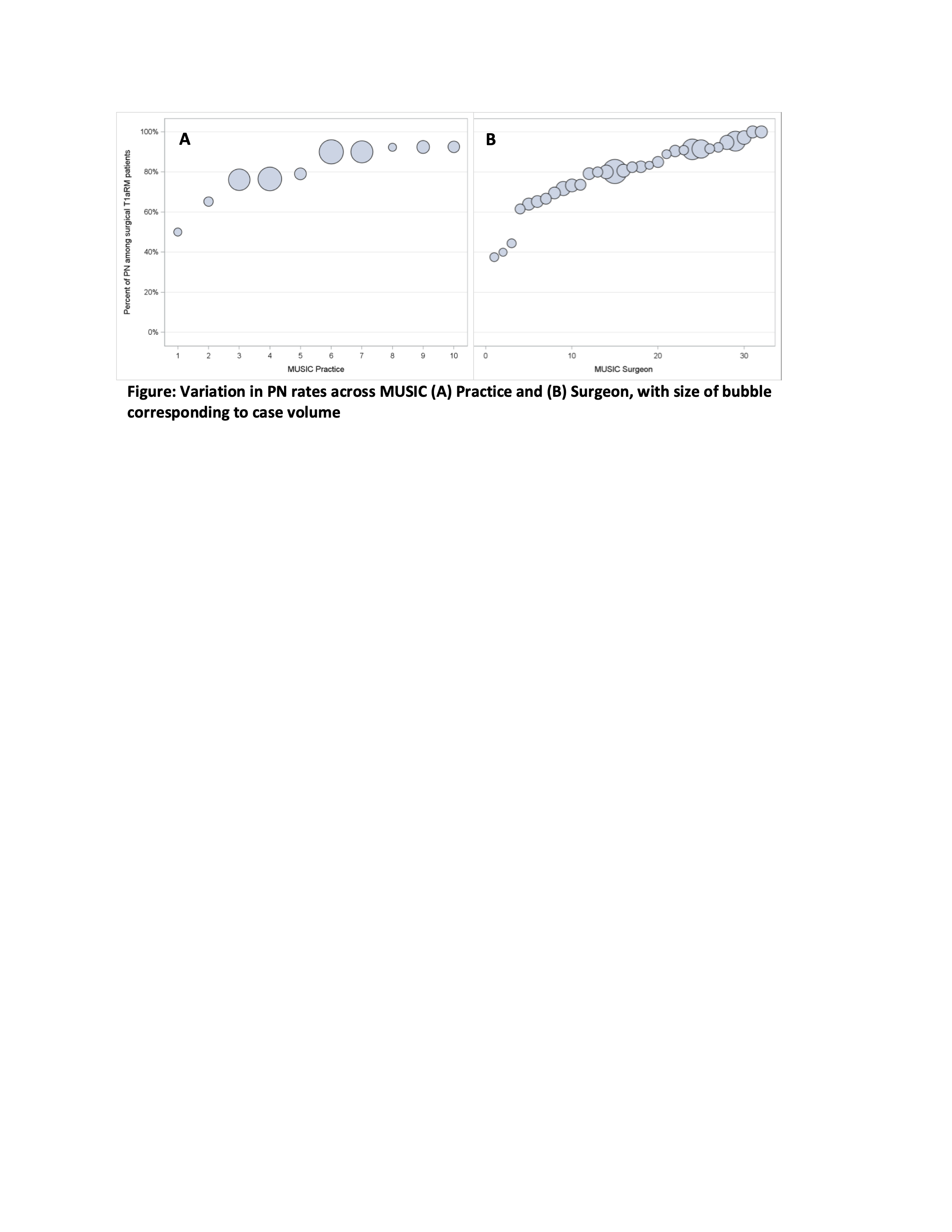 Introduction: Current guidelines recommend prioritizing partial nephrectomy (PN) over radical nephrectomy (RN) in the management of cT1a renal masses (T1aRM). We examined variation in PN use for surgically treated T1aRM and identified factors associated with PN use in the MUSIC-KIDNEY collaborative. Methods: All patients in the MUSIC-KIDNEY registry undergoing surgery for T1aRM between 5/2017 and 5/2022 were included. Practice- and surgeon-level variation in use of PN (vs RN) were evaluated among those who treated at least 5 patients surgically. Multivariable mixed-effects logistic regression model was performed to identify factors associated with PN use. Rates of prolonged hospitalization (>3 days for minimally invasive, >5 days for open), 30-day emergency department (ED) visits, and 30-day readmissions were compared between patients undergoing PN and RN, using Chi-squared test or Fisher’s exact test. Results: 1014 surgically treated T1aRM patients from 14 practices and 68 surgeons were included. Among these, 843 (83%) underwent PN and 171 (17%) underwent RN. Rates of utilization of PN ranged from 50-93% across practices and 38-100% across surgeons (Figure). Low patient comorbidity, preoperative GFR>60, and low nephrometry score (RENL 4-6) were associated with increased use of PN (p < 0.05). Postoperative ED visit rates were low for both RN and PN (3.5% vs 2.6%) and did not differ significantly (p>0.05). RN was associated with higher rates of prolonged hospitalization (19% vs 7.7%, p<0.05) and readmission (5.9% vs 2.9%, p<0.05). Conclusions: Over 80% of surgically treated T1aRM underwent PN in MUSIC-KIDNEY with variation across practices and surgeons. Association of high preoperative GFR with PN may be related to the high rates of surveillance (>50%) for T1aRM in MUSIC-KIDNEY for masses that may have otherwise undergone PN. Higher rates of prolonged hospitalization and readmission for RN may be related to higher baseline comorbidity. Quality improvement initiatives within MUSIC-KIDNEY include a PN video library and live peer-to-peer review sessions with the goal of increasing surgeon comfort and skill in PN. SOURCE OF Funding: Blue Cross Blue Shield of Michigan