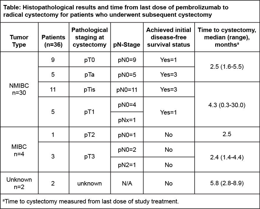 Introduction: Cohort B of the phase 2 KEYNOTE-057 (NCT02625961) study evaluated pts with BCG-unresponsive HR NMIBC with papillary tumors (no carcinoma in situ [C-IS]) who were ineligible for or declined radical cystectomy (RC). Herein we present the primary efficacy results and outcomes of pts who underwent subsequent cystectomy. Methods: Pts aged =18 y with BCG-unresponsive HR NMIBC with papillary tumors only (high-grade Ta or any-grade T1) at baseline and ECOG PS score of 0-2 received pembro 200 mg every 3 wk for =35 cycles (~2 y). Primary end points for cohort B were 12-mo disease-free survival (DFS) rate of HR NMIBC by central pathology/radiology review and safety. Secondary efficacy end points included 12-mo DFS rate of any disease (low-grade Ta, HR disease, and progressive disease). Time to RC and pathologic staging at time of RC were evaluated. Results: A total of 132 pts were enrolled with a median (range) of 10.0 (6.0-33.0) prior BCG instillations; 57 pts (43.2%) had T1 disease, and 75 pts (56.8%) had high-grade Ta disease. Pts received a median (range) of 9.5 cycles (1.0-35.0) of pembro. Median (range) follow-up was 45.4 mo (14.9-77.1). The 12-mo DFS rate of HR NMIBC was 43.5% (95% CI, 34.9-51.9); 12-mo DFS rate of any disease was 41.7% (33.1-50.0). Treatment-related AEs occurred in 97 pts (73.5%); 19 pts (14.4%) had a grade 3/4 treatment-related AE. No deaths from treatment-related AEs occurred. A total of 36 pts (28.3%) underwent RC after stopping pembro; 8 pts (18.6%) achieved initial disease-free status and 28 (45.9%) did not. Median (range) time from last dose of pembro to RC was 6.5 mo (1.0-16.0) for those who achieved initial DFS status and 2.8 mo (0.3-30.0) for those who did not. Pathologic staging at RC is presented (table). Of 36 pts who underwent RC, 4 known pts (11.1%) had upstaging to MIBC; none of these pts experienced an initial disease-free status. Conclusions: After approximately 45 mo of follow-up, pembro monotherapy demonstrated antitumor activity in pts with BCG-unresponsive non-CIS papillary NMIBC. Rates of upstaging at time of RC are consistent with previous reports, suggesting that the window of opportunity for subsequent curative RC is generally preserved. SOURCE OF Funding: Merck Sharp & Dohme LLC, a subsidiary of Merck & Co., Inc., Rahway, NJ, USA