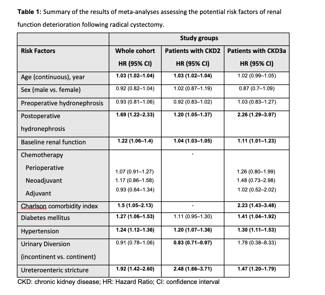 Introduction: The literature lacks high level of evidence regarding renal function changes and related contributing factors following radical cystectomy (RC). The aim of this study was to evaluate the potential risk factors of renal function deterioration in patients with bladder cancer undergoing RC. Methods: PubMed, Web of Science, Cochrane Library, and Scopus databases were searched for articles published by September 2022 according to the PRISMA (Preferred Reporting Items for Systematic Reviews and Meta-Analyses) statement. After quality and risk of bias assessments, eligible studies were included in the meta-analysis. The primary outcome was renal function deterioration following RC, which was defined as significant (=10%) decline of estimated glomerular filtration (eGFR) rate and/or any chronic kidney disease (CKD) upstaging. In addition, subgroup meta-analyses were conducted in patients with pre-operative CKD stages 2 and 3a (eGFR 60-89 and 45-59 mL/min, respectively). Results: A total of 10 articles, comprising 15,502 patients, were deemed eligible for this study. On meta-analysis of the whole cohort, factors that were associated with renal function deterioration following RC included older age (HR 1.03 per year, 95% CI 1.02–1.04), lower baseline renal function (HR 1.22, 95% CI 1.06–1.4), higher Charlson comorbidity index (HR 1.5, 95% CI 1.05–2.13), diabetes mellitus (HR 1.27, 95% CI 1.06–1.53), hypertension (HR 1.24, 95% CI 1.12–1.36), postoperative hydronephrosis (HR 1.69, 95% CI 1.22–2.33), and uretero-enteric stricture (HR 1.92, 95% CI 1.42–2.60). The results of the subgroup analyses in CKD stages 2 and 3a are shown in Table 1. Conclusions: Older age, lower baseline renal function, higher Charlson comorbidity index, diabetes mellitus, hypertension, postoperative hydronephrosis, and ureteroenteric stricture are significant risk factors of CKD deterioration following radical cystectomy. SOURCE OF Funding: None