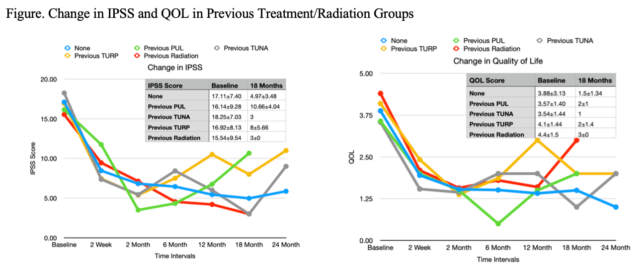 Introduction: Lower urinary tract symptoms (LUTs) caused by benign prostatic hyperplasia (BPH) in men is one of the most frequently encountered complaints in the urologist's office. Prostatic urethral lift (PUL) has been shown to be an efficacious and a minimally invasive treatment for BPH. There is a paucity of data with salvage PUL in BPH. The aim of the study is to determine the effect of PUL in patients with previously treated BPH and radiation therapy. Methods: A retrospective chart review was performed on 445 patients between 6/2016 to 5/2022 of a single surgeon’s experience with PUL. Patients were subgrouped into those that had previous transurethral resection of prostate (TURP), transurethral needle ablation (TUNA), PUL, or radiation therapy (external beam radiation or brachytherapy). The previously treated groups were then compared to those undergoing primary PUL (no previous treatment for BPH). Patient demographics, international prostate symptom score (IPSS) and quality of life (QOL) were assessed through 24 months. Results: A total of 444 patients were retrospectively reviewed. The previous prostatic urethral lift group consisted of 8 (1.8%) patients, previous TUNA had 12 (2.7%) patients, previous TURP had 15 (3.3%) patients and the previous radiation group had 14 (3.1%) patients of the total cohort. The previous urolift group were older (80.9 years) and had larger prostate volume (69.9 grams). The previous TURP group had the largest post void residual (PVR) at 276.1ml. The decrease in IPSS was seen in all groups that were noninferior to primary PUL (no prior treatment group). There was statistical significance for IPSS for the prior radiation group compared to primary PUL at 18 months (4.97 vs. 3.0). Conclusions: Efficacy of PUL has not been well studied in patients with previous prostatic treatments. Our study is one of the largest single surgeon’s experiences with patients with PUL. We show that repeated PUL in patients that had previous PUL, TUNA, TURP, or radiation can be effective. SOURCE OF Funding: n/a
