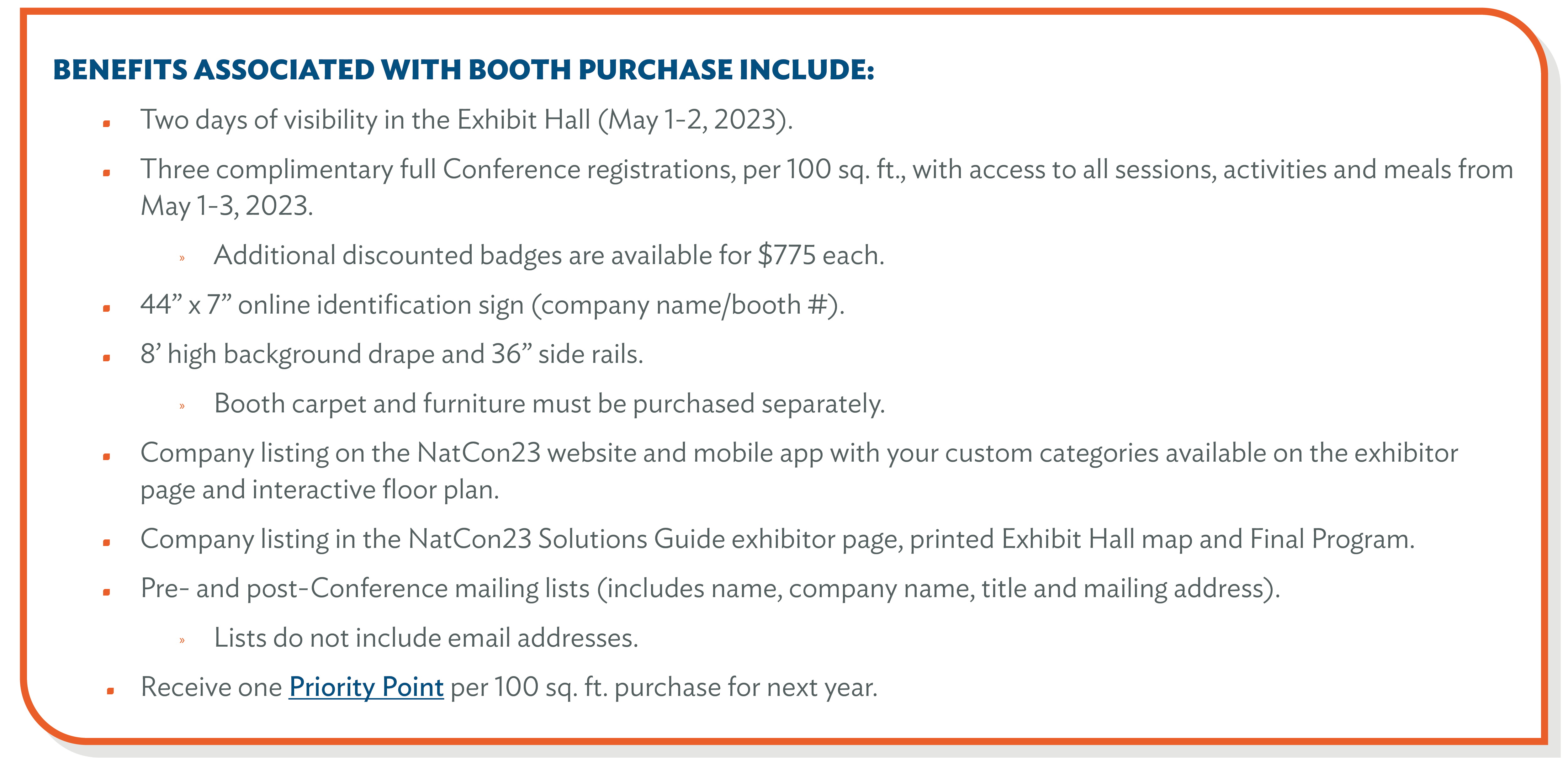 Companies participating in the National Council Partnership Program will be able to purchase NatCon23 booths at a discounted rate. Visit the National Council Partnership Program to learn more.