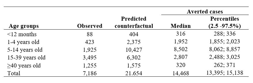 Table 2: Number of observed, predicted counterfactual, and averted hepatitis A cases in the post- HepA vaccination period (2015-2018), according to age group.