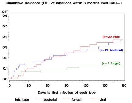 Median age was 66 (23-84) years; 48% (29) were female. The most common cancer was non-Hodgkin lymphoma (89%, 54). 25% (15) had a prior stem cell transplant (SCT). 73% (44) and 45% (27) of pts developed CRS and CRES, respectively. 43% (26) received steroids; 65% (39) received tocilizumab. In the 6 mo pre-CTT, 39 infections occurred in 45% (27) of pts. 103 infections occurred in 66% (40) after CTT; 33 (55%) had an infection within 6 mo. Infections were bacterial (52%; 54/103), viral (30%; 37/103), fungal (10%; 10/103), mycobacterial (1%; 1/103), protozoal (1%; 1/103). Cumulative incidence of infection in the first 6 mo are shown in Fig 1. All-cause and infection-related mortality were 32% (19) and 15% (9), respectively. Mortality among pts with fungal infections was 20% (2/10). Infection density was 1.28 and 0.58 infections per 100 pt-days between days 0-30 and 30-89, respectively. Factors associated with infection post CTT were number (no.) of infections in the 6 mo prior to infusion (HR 1.62, CI [1.1-2.38]; p=0.015), no. of lines of therapy in the 6 mo pre-CTT (HR 1.52, CI [1.01-2.27]; p=0.04), prior allogeneic SCT (HR 5.96, CI [1.34-26.47]; p=0.019), and no. of tocilizumab doses. Grade 1 CRS and grade 2 CRES were risk factors between days 0-30 and 0-180, respectively (HR 4.67, CI [1.02 -21.4], p = 0.047; HR 2.48, CI [1.17-5.23], p = 0.02).Fig 1: Cumulative Incidence of Infection 6 Months Post CAR T-cell Therapy