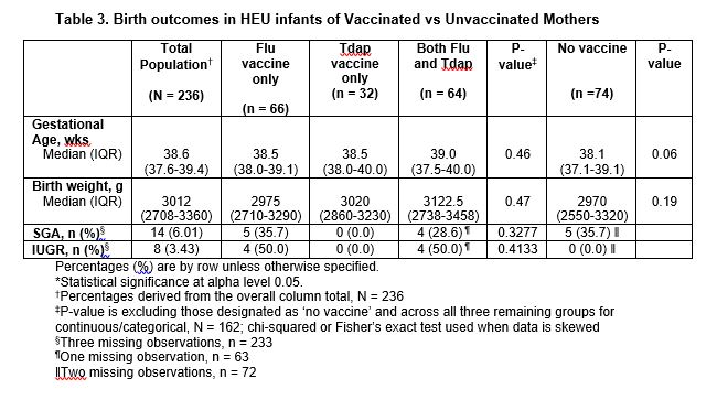Table 3. Birth outcomes in HEU infants of Vaccinated vs Unvaccinated Mothers