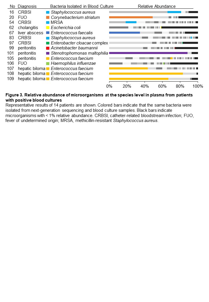 Relative abundance of microorganisms at the species level in plasma from patients with positive blood cultures
