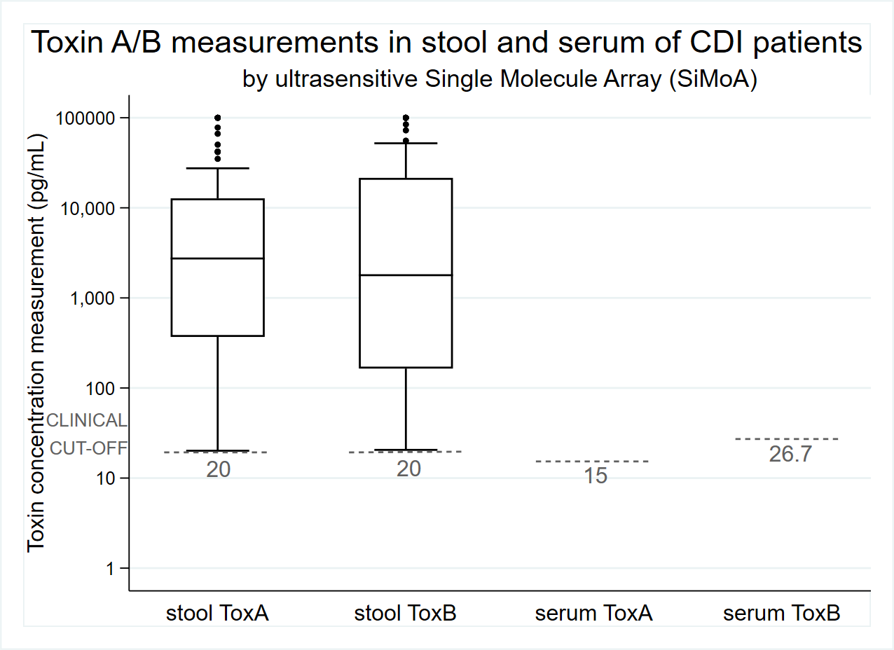 Figure 1. Comparison of TcdA and TcdB concentrations, as measured by Simoa, in serum and stool. Clinical cutoffs are shown: stool, 20 pg/ml for TcdA and for TcdB; serum 15.0 pg/ml for TcdA and is 26.7 pg/ml for TcdB. Signals below these cut-offs are below backgrounds and so negative.