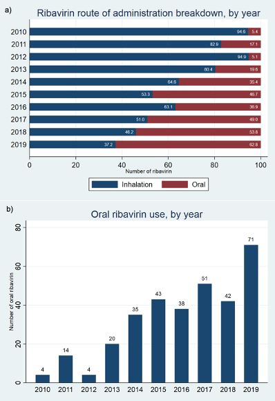 Figure 2: (a) Route of administration (inhalation versus oral), by year during the study period and (b) use of oral ribavirin over time during the study period