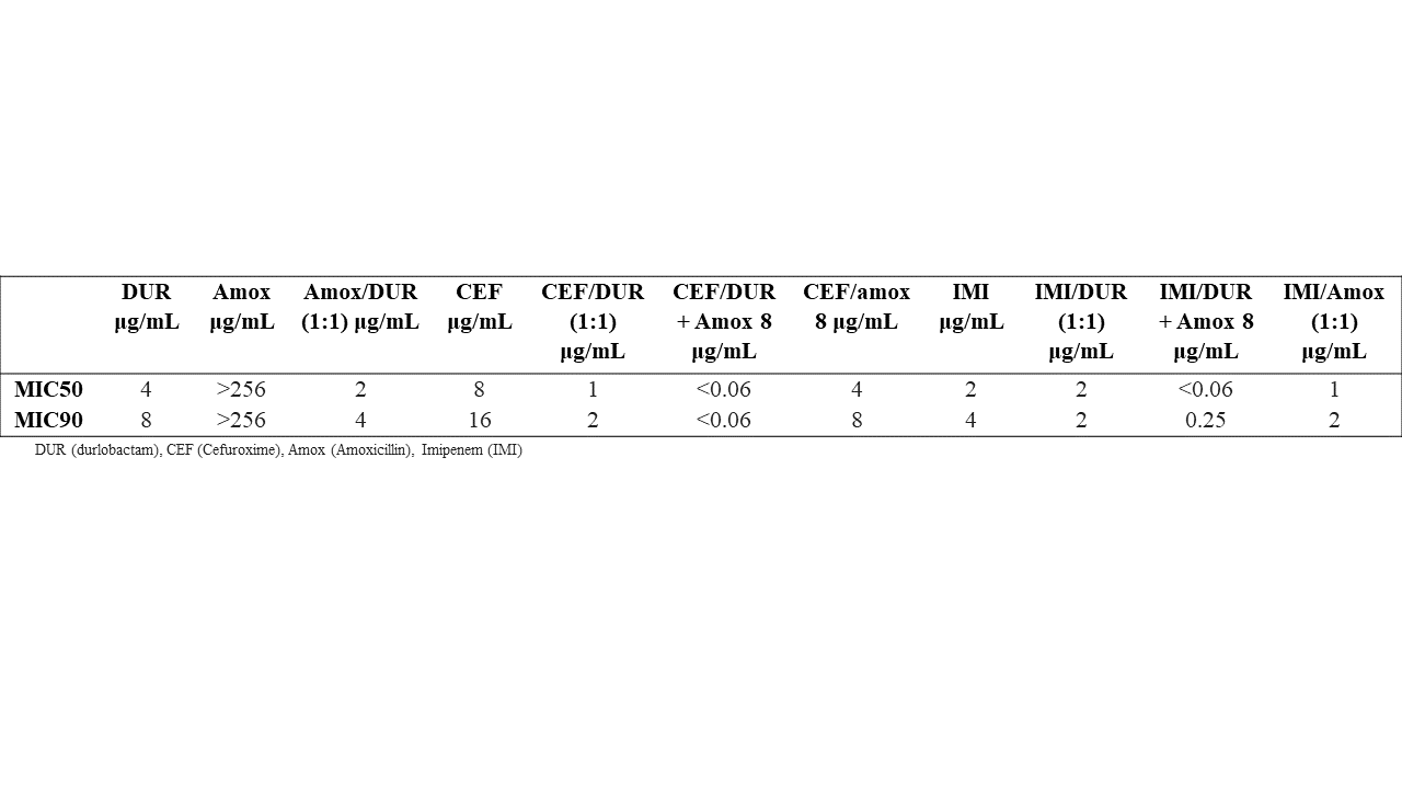 MIC50 and MIC90 of 100 Mab clinical strains against DUR alone and in combination with Amox, CEF and IMI